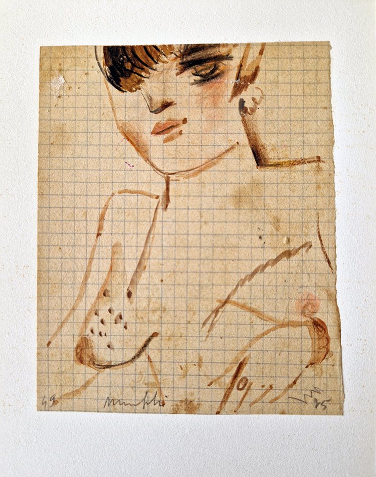 16°; a fogli sciolti frontespizio e colophon seguiti da acquerello firmato e dieci incisioni numerate e firmate a matita. Al piatto della cartellina un linoleum a colori, edizione di soli 10 esemplari numerati e firmati pubblicati fuori commercio a cura di un amico dell'artista e stampata dalla Stamperia Val De Olmo. Esemplare arricchito da una dedica dell'artista con un piccolo disegno ad un collezionista. Cfr. Manfredi Illustratore n.70<BR>(vedi riproduz.)