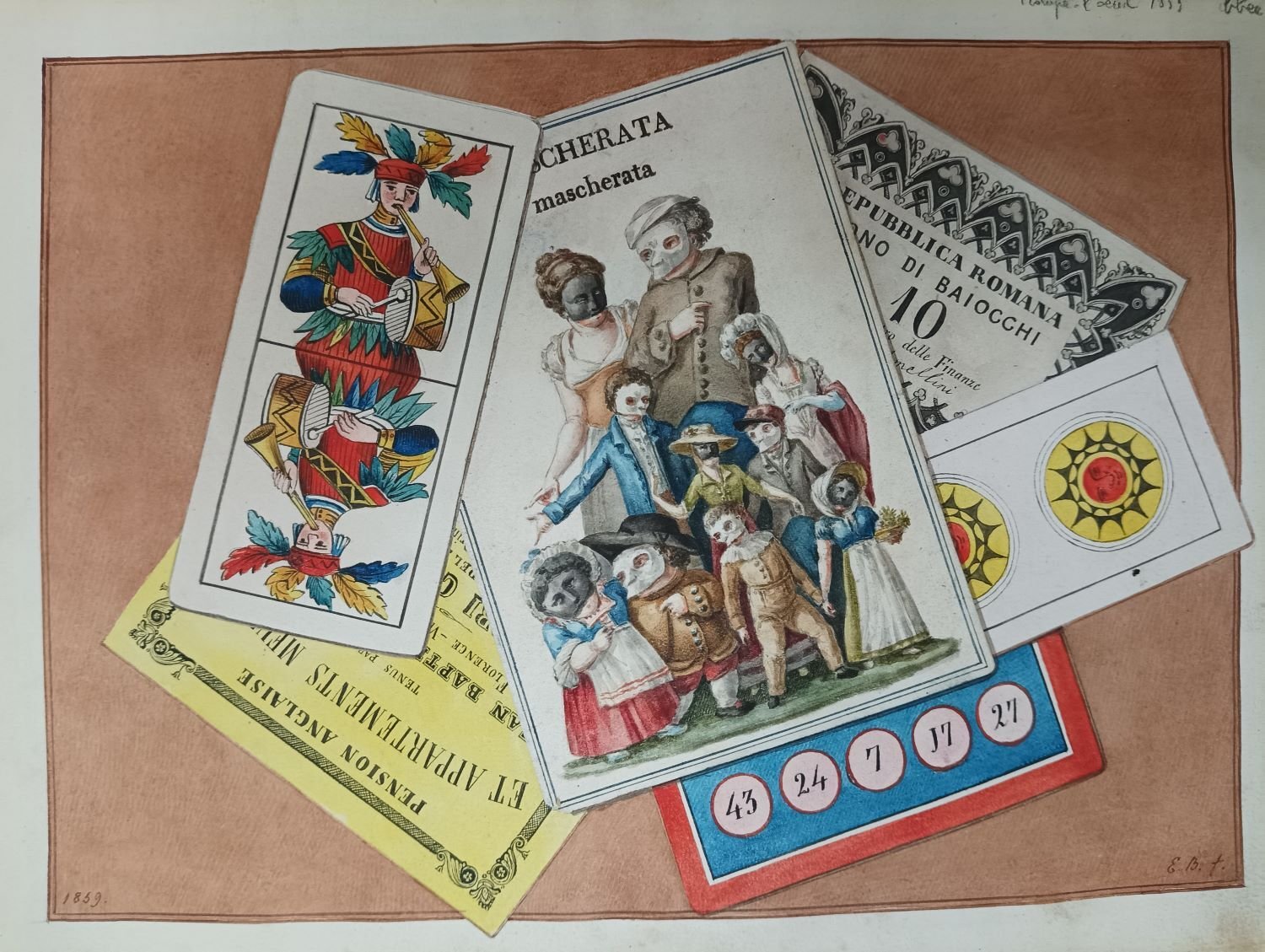 >Litografia originale colorata (mm 185 x 260), con curiosa miscellanea di carte da gioco, tessera della tombola e raffigurazione di mascherate (quest'ultima incollata). Sigla di autore sconosciuto E.B.T. in basso a destra, data 1859 in basso a sinistra.