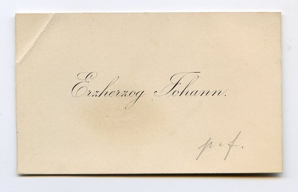 1 p. With two addenda. According to the accompanying description by a contemporary hand, the Archduke "left this visiting card himself with the President of the Provincial Court, Gustav Ritter von Klier-Hellwart in Linz, on New Year's Day in 1887". The card bears the Duke's note "p. f." (i. e., "pour féliciter"), with a similar note, by another contemporary hand, on the reverse.