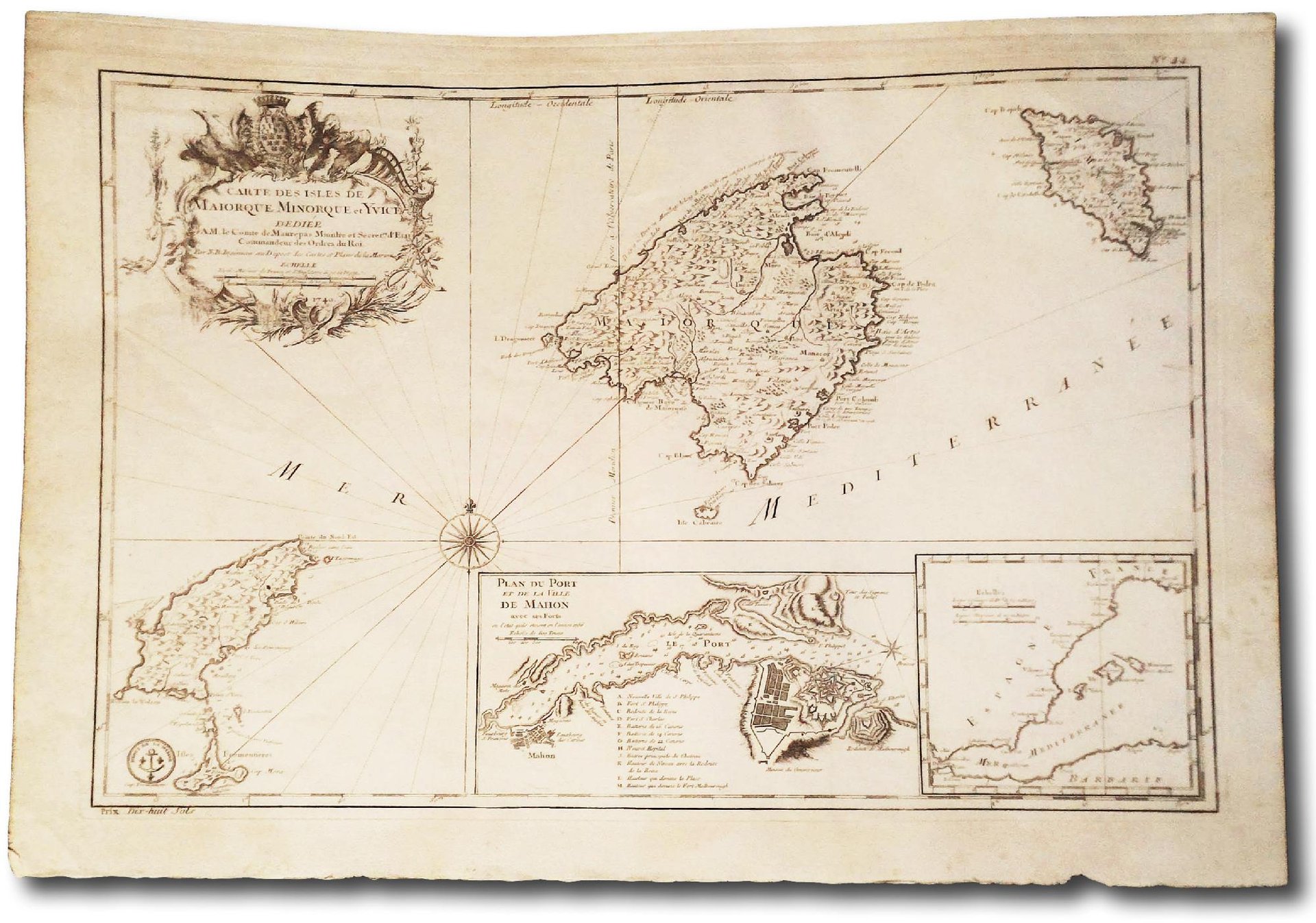 >Incisione in rame in bianco e nero, mm 420x580 e margini. Titolo entro cartiglio nella parte superiore sinistra del rame. Rara carta geografica che descrive le isole di Minorca, Maiorca , Ibiza e Formentera ( nella porzione inferiore sinistra del rame). Nella parte inferiore destra, la pianta del porto di Mahon, principale porto e capitale dell'isola di Minorca. A fianco una piccola carta con lo stretto di Gibilterra, le coste spagnole, marocchine e algerine ed al centro le isole baleari. In basso a sinistra sulla battuta del rame l'antico prezzo: "Prix dix-huit sols". Rara carta, una delle prime con l'isola d'Ibiza. Esemplare perfettamente conservato. Phillips, Atlases 587-590, 4288