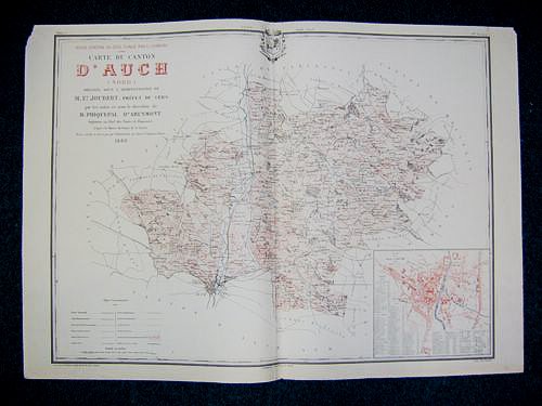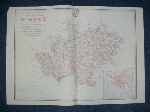 Carte du Canton dressée sous l'Administration de M. E. Joubert, préfet du Gers, par les soins et sous la direction de M. Phiquepal d'Arusmont, Ingénieur en chef des Ponts et Chaussées, revue, corrigée et mise à jour par l'Administration des Ponts et Chaussées, 1 carte en trois couleurs, 90.5 x 65 cm, gravée par A. Simon, Paris, Imp. Becquet, L. Chanche, Auch, 1880, échelle 1/40 000, avec le plan de la ville d'Auch en cartouche (échelle 1 / 5 000) Bon état (pliure centrale habituelle, très petit manque angulaire n'affectant pas l'impression, bel état par ailleurs).