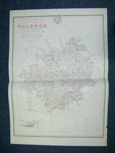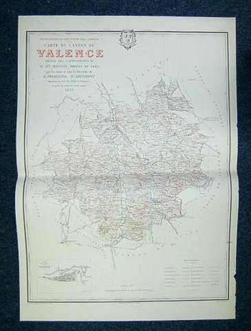 Carte du Canton dressée sous l'Administration de M. Henri Monod, préfet du Gers, par les soins et sous la direction de M. Phiquepal d'Arusmont, Ingénieur en chef des Ponts et Chaussées, revue, corrigée et mise à jour par l'Administration des Ponts et Chaussées, 1 carte en trois couleurs, 90 x 64 cm, L. Chanche, Paris, 1879, échelle 1/40 000, avec le plan de la ville de Valence en cartouche (échelle 1 / 10 000) Bon état (pliure centrale habituelle, très petits frottements en marge n'affectant pas l'impression, bel état par ailleurs).