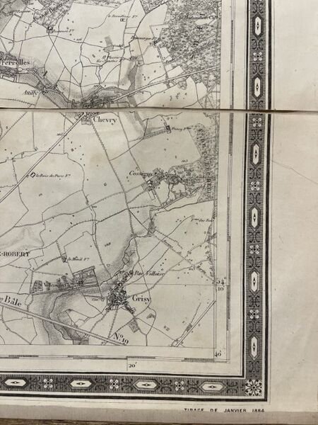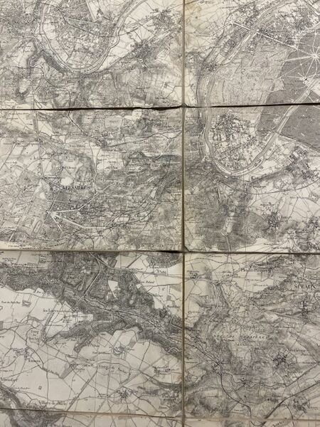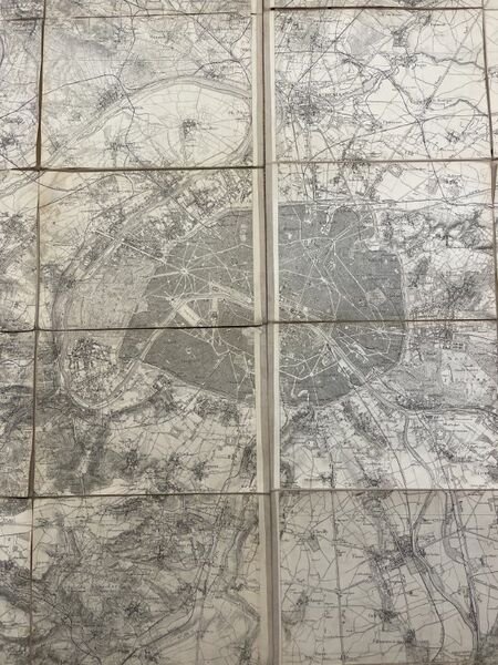 Dépot de la Guerre 1884 Dépot de la Guerre, 1884. Carte entoilée des environs de Paris en deux pans chacun de 106 x 75 cms et de 18 feuilles toutes présentes, soit un panneau en deux parties de 212 x 150 cms et 36 feuilles. Frise d'encadrement. Echelle 1/40 000. Imprimée par l'Imprimerie linéographique du Dépôt de la Guerre. Mention de provenance dans un cartouche "A. Bouyssou, Lieutenant 78e Infanterie - Ecole de Guerre 1885-87" . Devenu Général il intégra un temps le 122 e RI de Rodez (Aveyron). On note le mur d'enceinte entourant Paris. Très bon exemplaire.