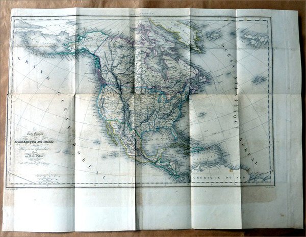 Une carte de L'Amérique du nord, frontières des états aquarellées; gravée sur cuivre par Desbuissons, textes de Bénard. Dimensions 54,5 x 41 cm; Traces de pliage. discrète restauration en partie gauche sans manque Bel état. L'Alaska appartenait encore à la Russie. Voir la photo.