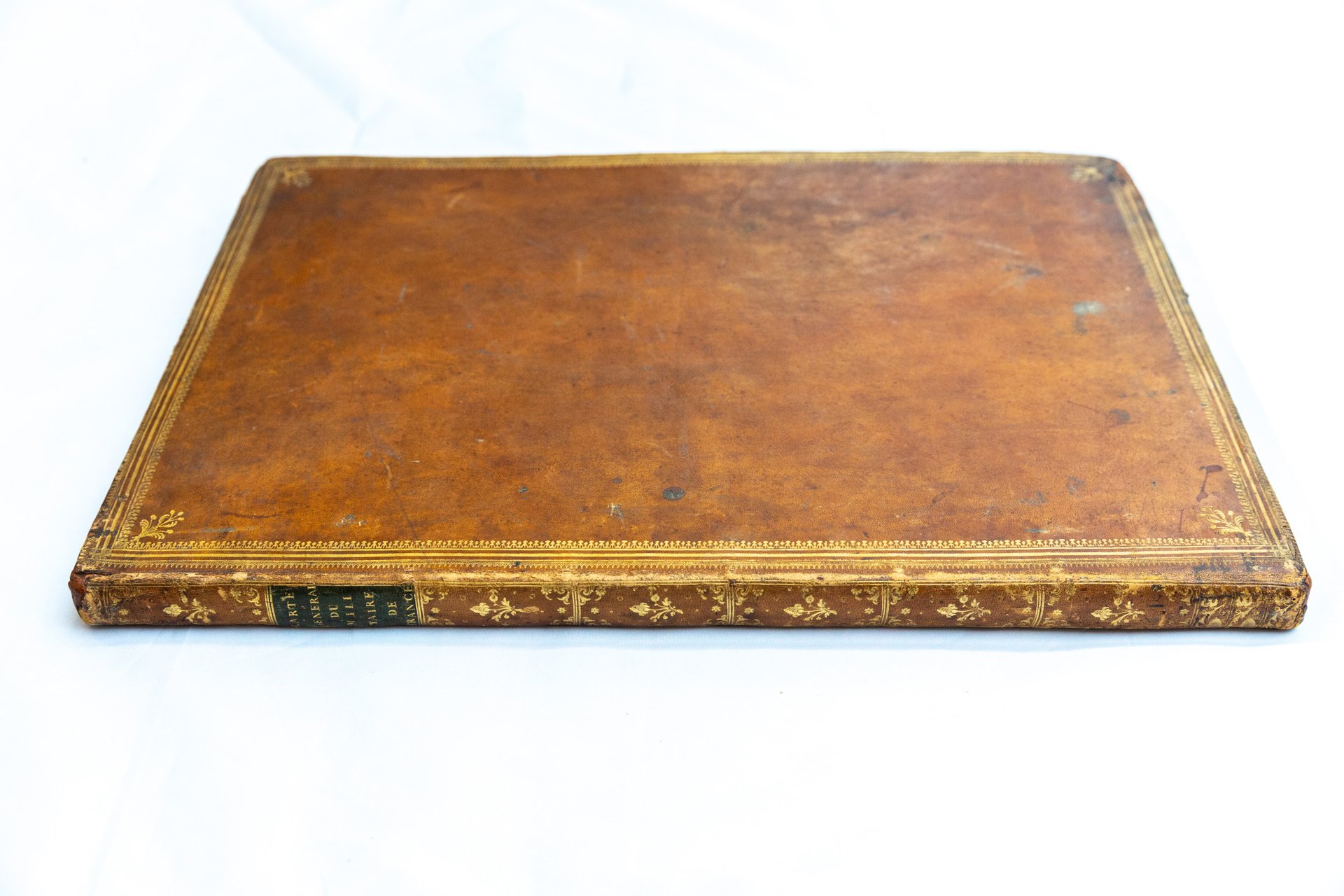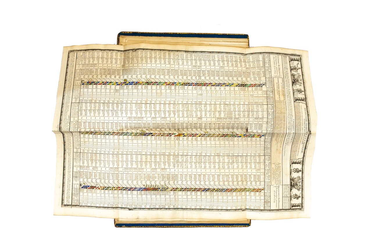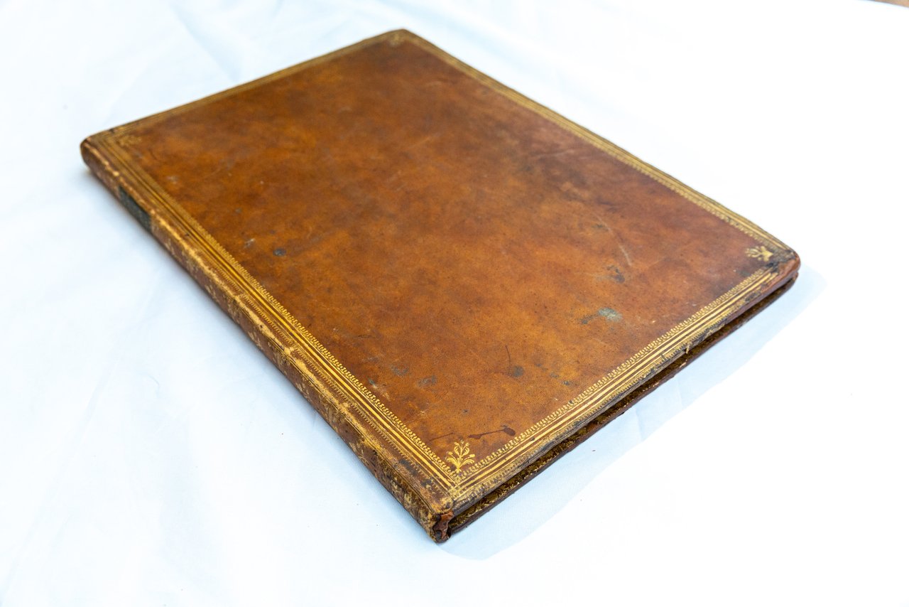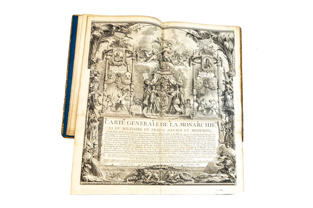 In folio, mm 495x345; 18 carte eccezionalmente incise su doppia pagina comprendenti: il frontespizio, una magnifica dedicatoria allegorica al Re di Francia con i ritratti dei sovrani e 16 incisioni di cui 2 ripiegate. Bella legatura coeva in marocchino nocciola, molteplici filetti ai piatti con fleuron agli angoli, dorso riccamente decorato da fregi floreali e titolo su tassello in pelle verde, tagli dorati. Impercettibile restauro alle cuffie e agli angoli, peraltro esemplare assai fresco e di gran pregio. Prima tavola con testo entro bordura raffigurante le medaglie dei monarchi francesi dal 1310 al 1715 - seconda tavola comprendente tutti gli ordini militari e cavallereschi di Francia - terza tavola: illustra due alberi genealogici (re di Francia e famiglia Borbone) con al centro una splendida veduta di Parigi e nella parte inferiore i vessilli dello Stato Maggiore, acquarellati a mano - la quarta tavola: gli alberi genealogici e i vessilli della Gendarmeria, parzialmente acquarellati - quinta, sesta ripiegate e doppie: si trovano acquarellati da mano coeva gli stendardi della Fanteria e della Cavalleria. Al termine della prima parte tre tavole riccamente decorate che elencano: Ministri, Artiglieria, Generali e Marescialli di Francia. La seconda parte composta da 7 tavole a doppi a pagina è dedicata a 105 città di Francia, con gli stemmi acquarellati di ognuna e la relativa pianta topografica, il tutto arricchito da grandi figure allegoriche simboleggianti i punti cardinali. Chiude sontuosamente l'opera il grande privilegio reale entro cornice decorata, nella parte inferiore dell'ultima tavola. Quest'opera di araldica francese, di per sé notevole per la ricchezza tipografica degli ornamenti e dell'iconografia, è qui presentata in un esemplare superbo per la qualità della coloritura coeva e la rilegatura in marocchino. Bibliografia: Cohen, 620. Brunet, III, 970. Manca a Graesse.. *** TUTTI I NOSTRI LIBRI SONO VISIBILI PREVIO CONTATTO MAIL O TELEFONO NELLA NUOVA SEDE DI MILANO: LIBRERIA COSMOPOLIS, VIA JOMMELLI, 22. ***