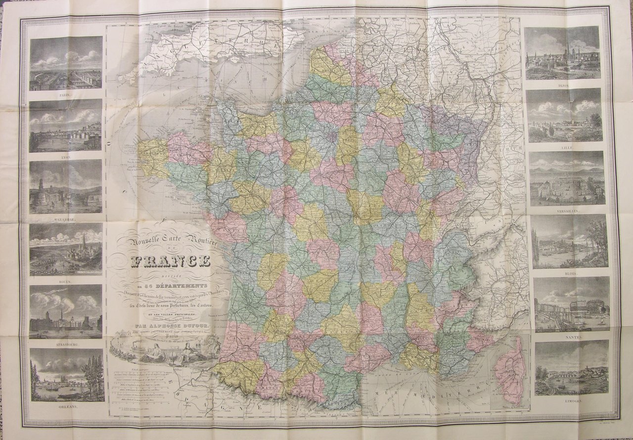 Paris Bernardin-Béchet et Fils, éditeur, 31 quai des Grands-Augustins, sans date vers 1880. Carte revue et augmentée par Lallemand géographe, divisée en 86 départements donnant les chemins de fer terminés et ceux votés par les chambres, avec toutes les voies de communication des chem. de fer des États limitrophes, les chefs lieux de sous préfectures, les cantons et les villes principales avec les Archevêchés et Évêchés. Carte dépliante, avec sa reliure d'origine, plat illustré en couleur de 89 cm x 63 cm. Carte avec de chaque côté 12 gravures de ville : Paris, Lyon, Marseille, Rouen, Strasbourg, Orléans, Dijon, Lille, Versailles, Blois, Nantes, Limoges.