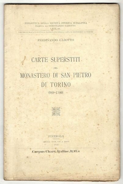 In 8°, pp. (2), da 141 a 214. Brossura editoriale. Copertina con fioriture, per il resto copia in ordine, interamente a fogli chiusi. Biblioteca della Società Storica Subalpina diretta da Ferdinando Gabotto, LXIX. III. Corpus Chart. Italiae, XLVII. III. Volume pubblicato sotto il patronato della Cassa di Risparmio di Torino.