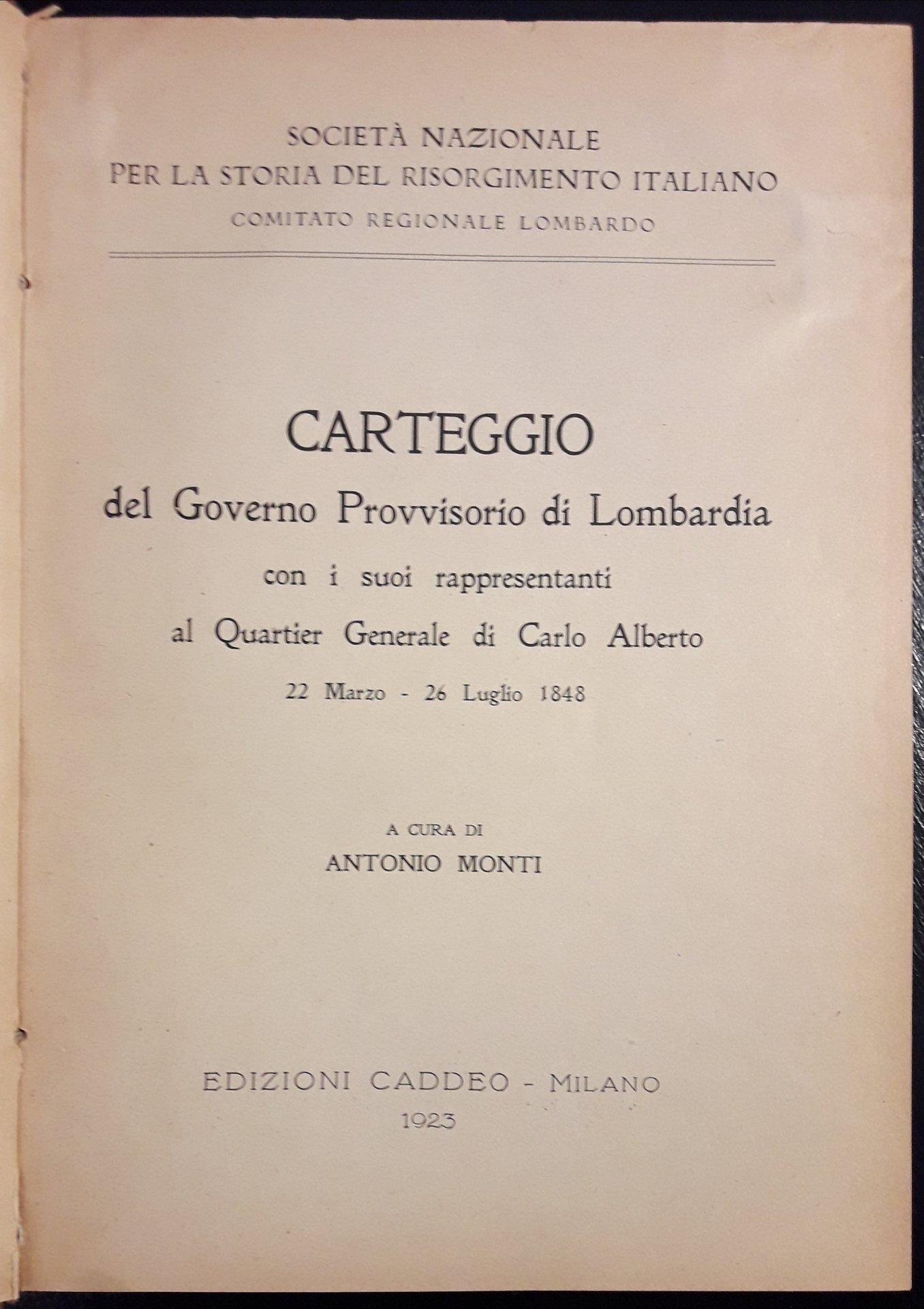 Carteggio del Governo Provvisorio di Lombardia con i suoi rappresentanti al Quartier Generale di Carlo Alberto. 22 Marzo - 26 Luglio 1848