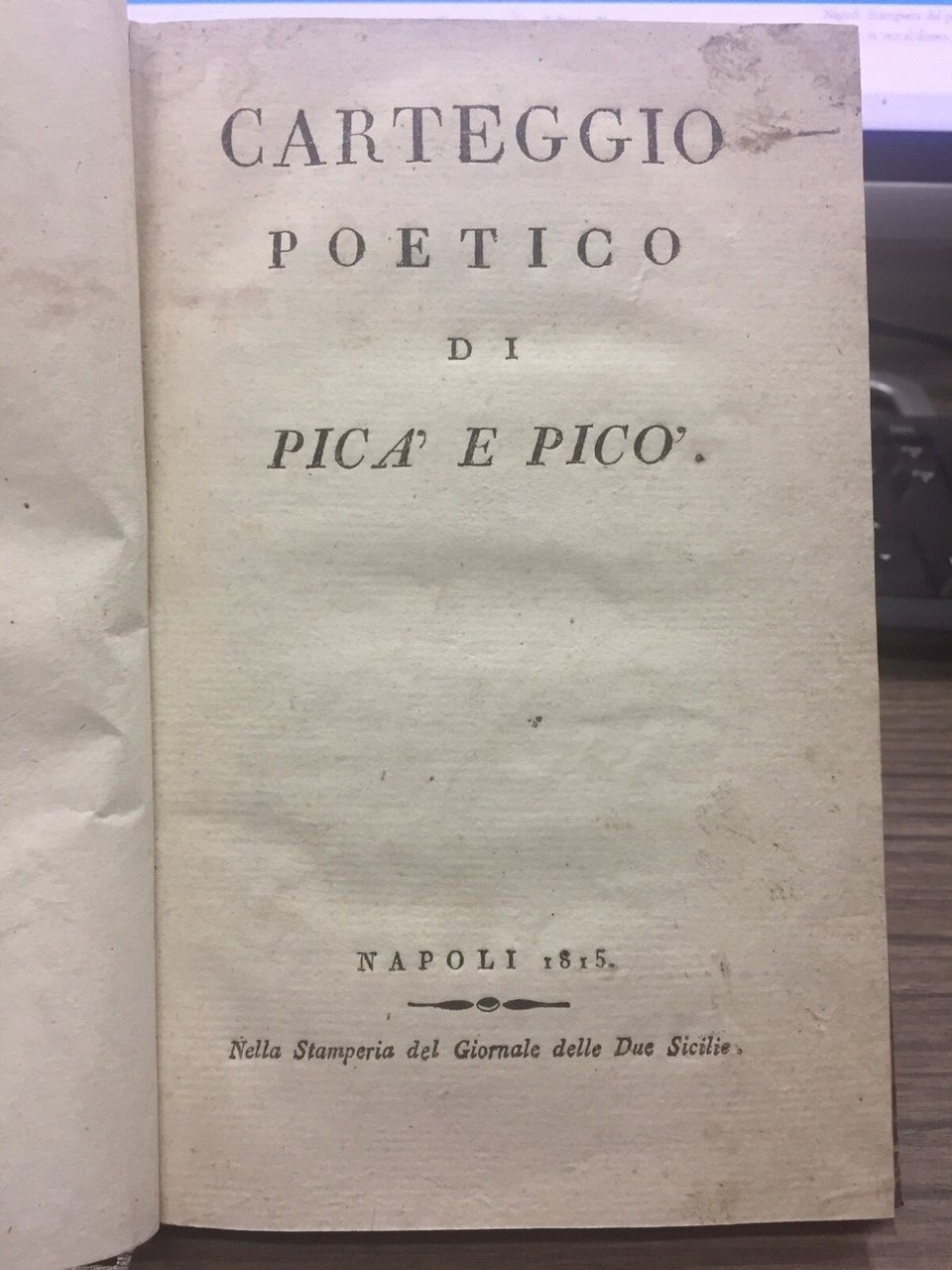 Napoli. Stamperia del giornale delle Due Sicilie 1815, 16°, pp. 104. Leg. Mz tela, tit. in oro al dorso, mancanze ai piatti. Segni del tempo.