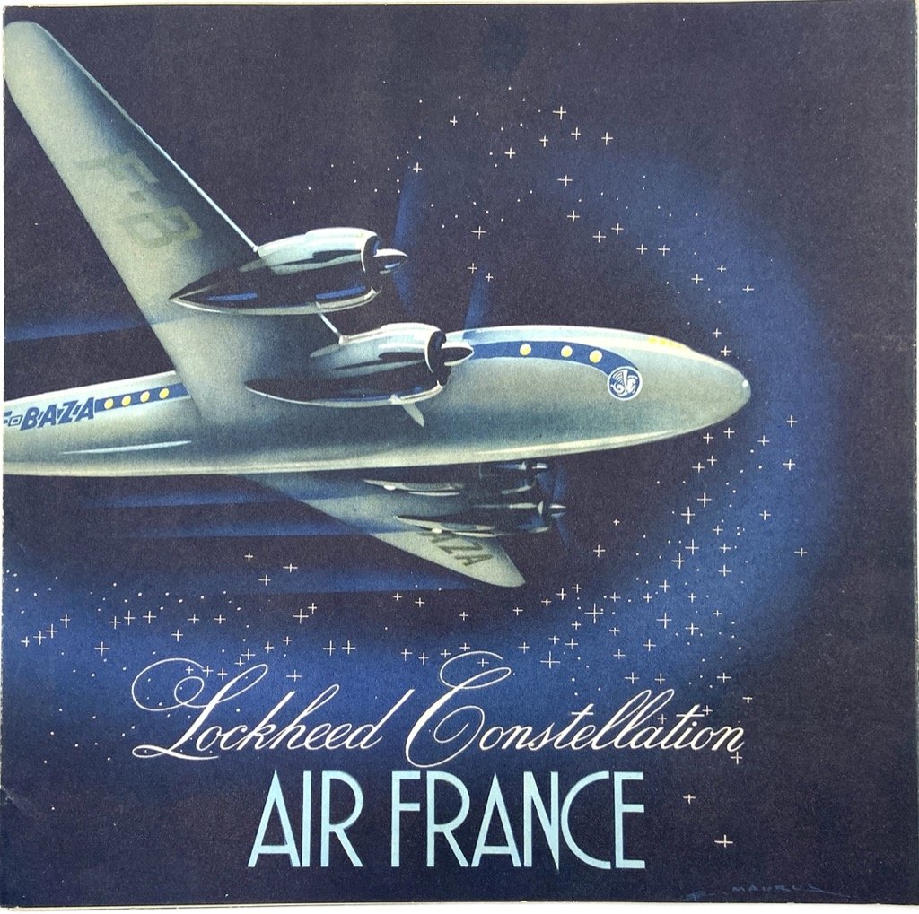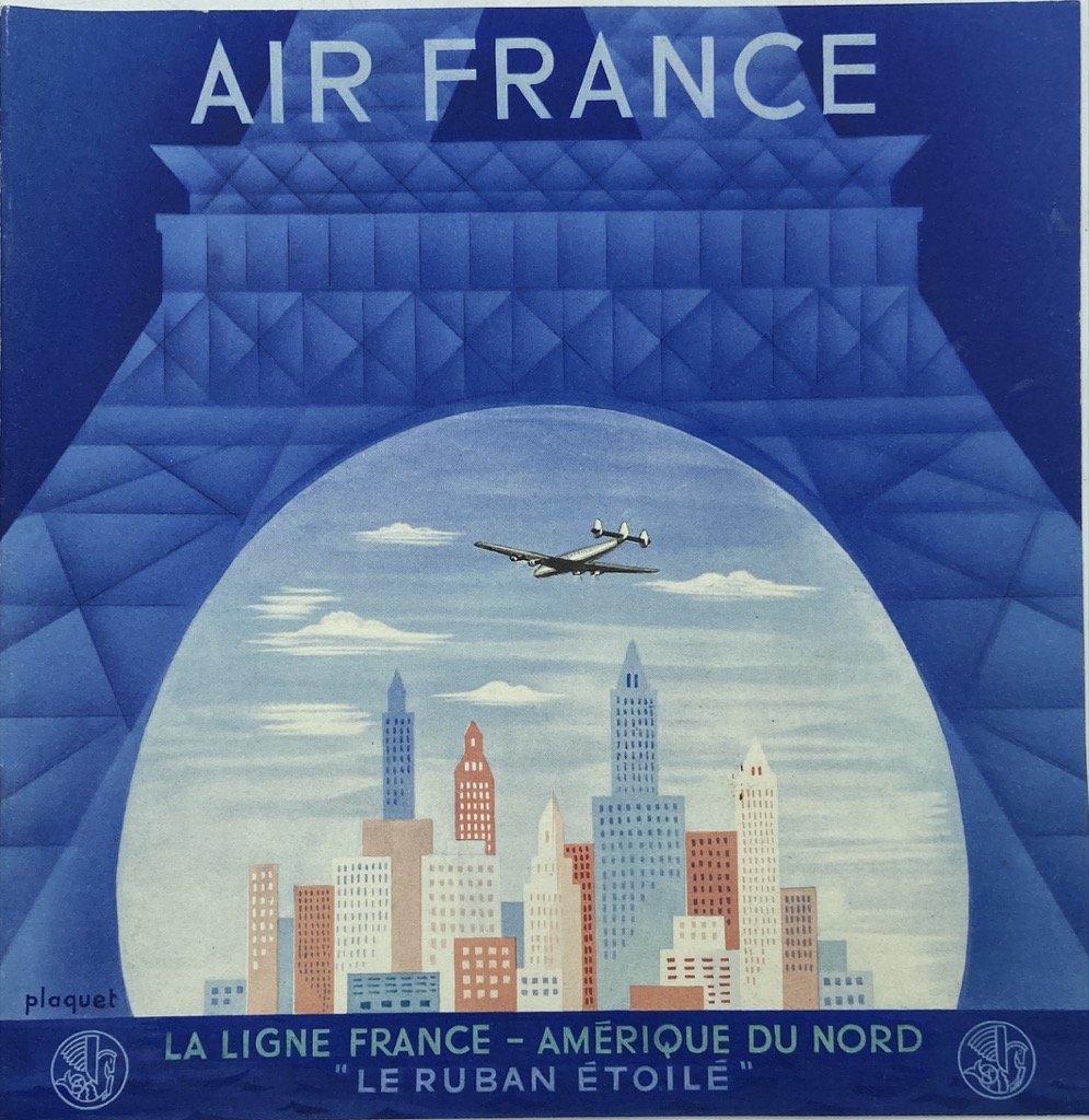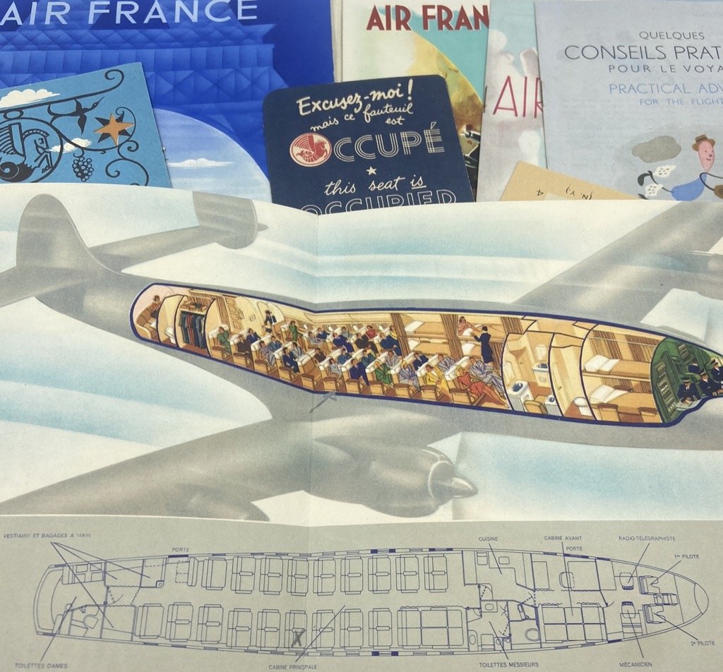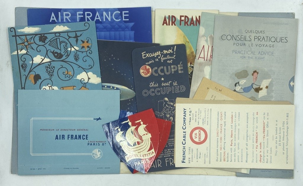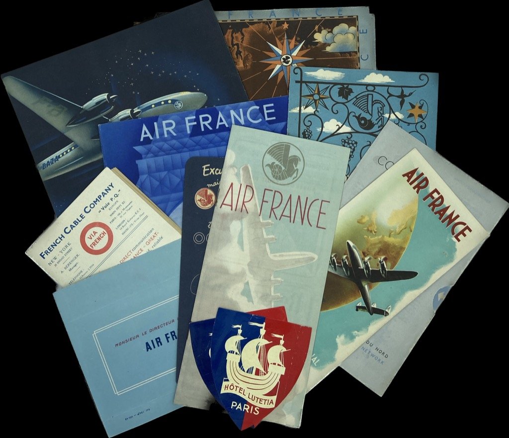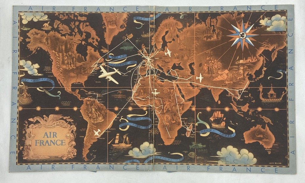 Cartella disegnata da Lucien Boucher con materiali promozionali per i voli intercontinentali Air France risalenti agli anni 1947-1948. AIR FRANCE EPHEMERA circa 1947-1948 in a folder decorated with Lucien Boucher planisphere design.