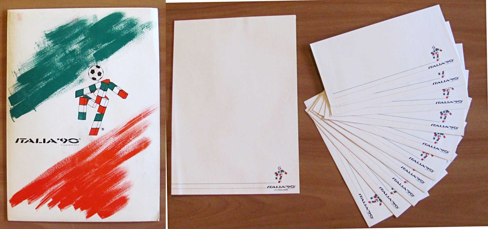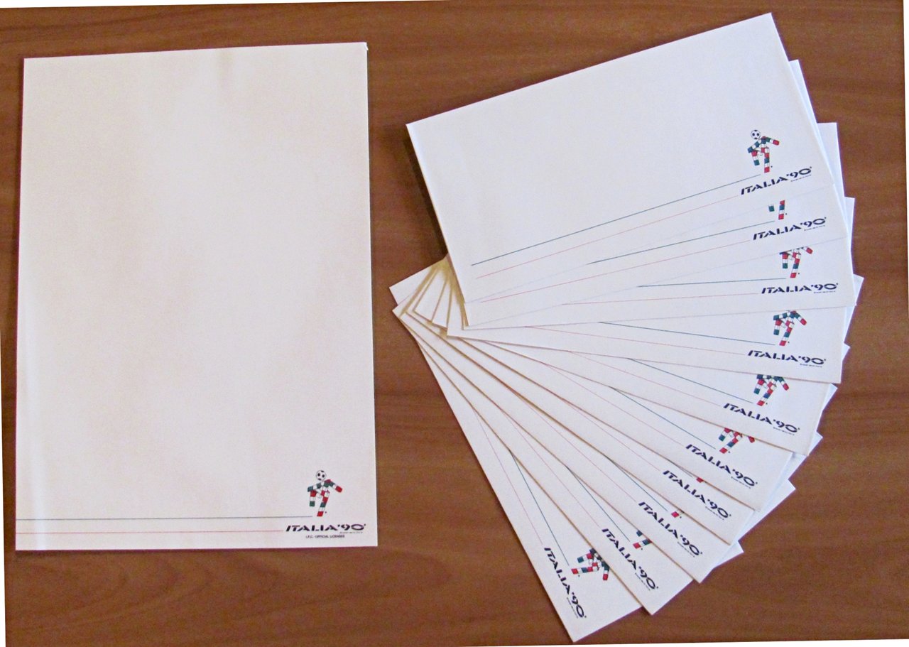 Cartellina contenente 10 buste e 10 fogli per lettere con logo Italia 90 e mascotte Ciao. Copyright Pelletterie Italiane Alta Moda. Cartellina 14x24; Buste 22,5x11; Fogli 21x28,5. Ottimo stato. , Molto buono (Very Good)