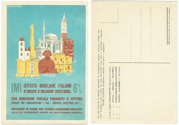 IMI - Istituto Mobiliare Italiano. XV emissione di Obbligazioni "Credito Navale" con sorteggio Premi per viaggi soggiorno gratuiti. Bella illustrazione a colori di Allulli. Ed. CREA Poligrafiche Riunite - Roma. Cartolina non viaggiata. 10,5x15. Ottimo stato. , Buono (Good)