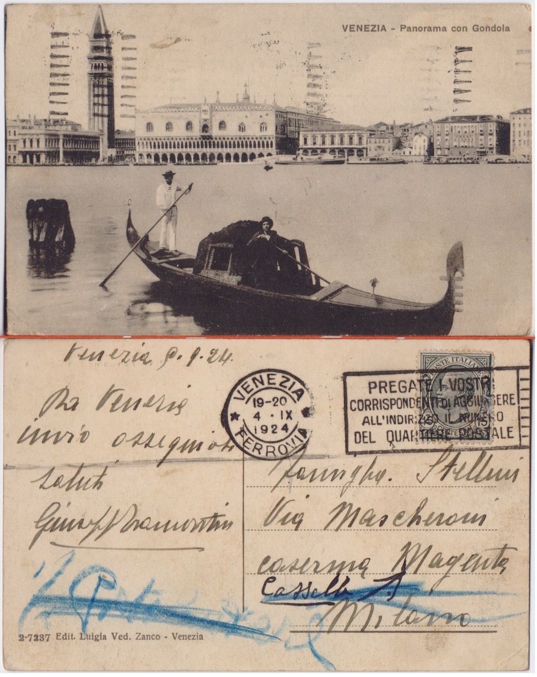 Cartolina - Venezia. Panorama con Gondola. Viaggiata 1924