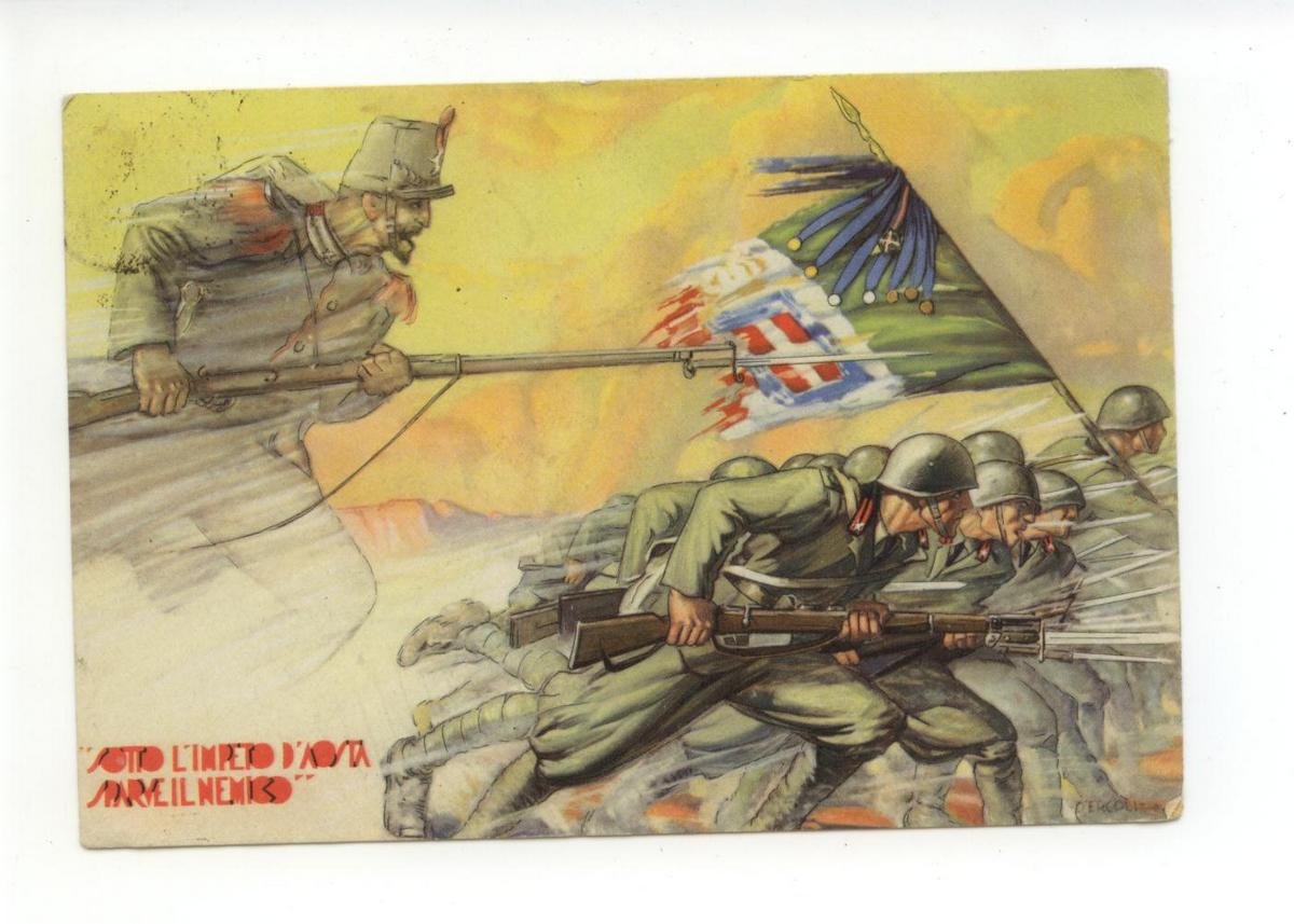 Cartolina originale, 6° Reggimento Fanteria Aosta" "Sotto L'Impeto d'Aosta Sparve Il Nemico" S. d. (anni trenta); cartolina originale ill. a col. Cm 15x10,5 (formato grande). Viaggiata. Condizioni di conservazione Cartolina ben conservata (vedi foto). CART.2867G "