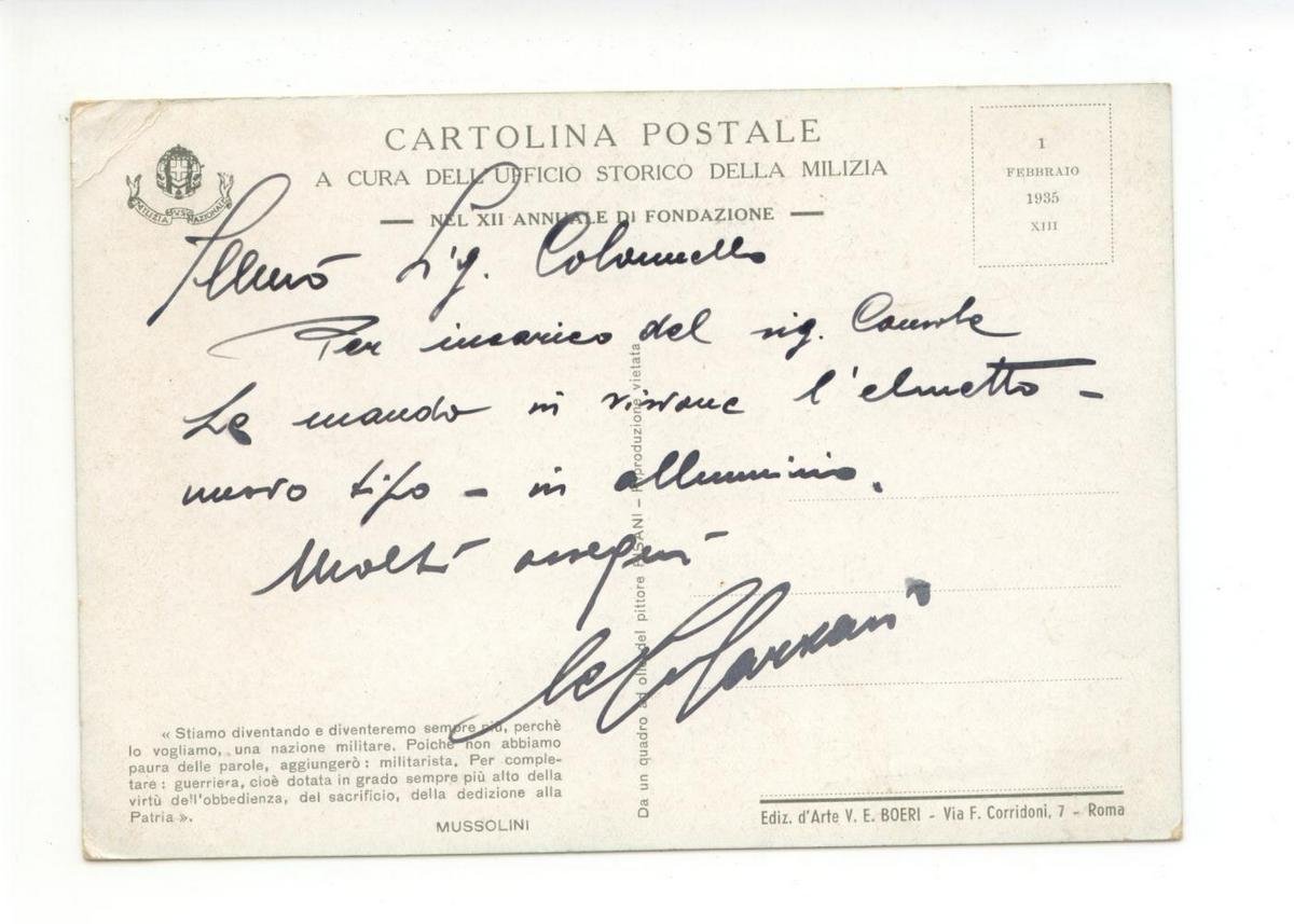 Cartolina originale, A Cura dell'Ufficio Storico della Milizia nel XII Annuale di Fondazione S. d. (anni quaranta); cartolina originale ill. a col. Cm 15x10,5 (formato grande). Viaggiata. Condizioni di conservazione Cartolina ben conservata (vedi foto). Il messaggio del mittente include la frase in visione l'elmetto nuovo tipo in alluminio". CART.2918G "