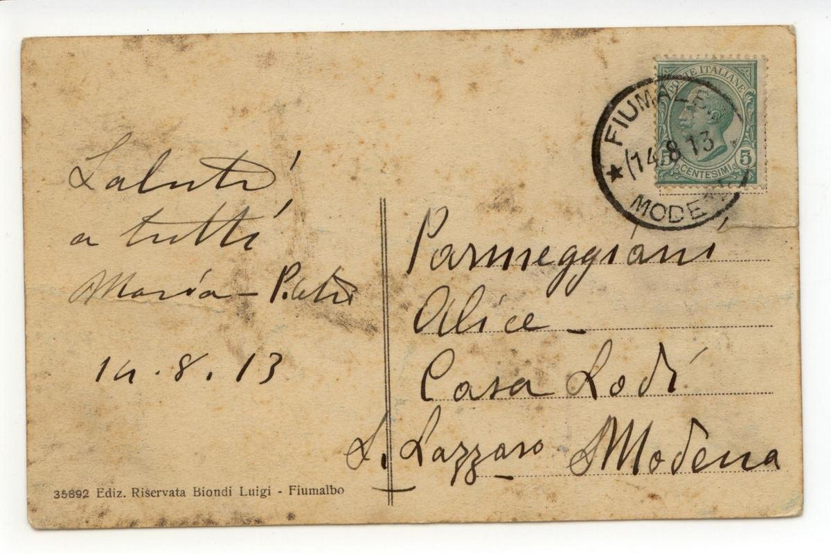 Cartolina originale, Appennino Modenese Fiumalbo -Via Giardini Ediz. Riservata Biondi Luigi, Fiumalbo, 1913; cartolina originale ill. in b/n. Viaggiata. Figurata. Cm 14x9. Condizioni di conservazione Cartolina ben conservata. Aloni di gora al fronte e bruniture sparse al retro. Condizioni modeste ma collezionabile (vedi foto). CART.3222G