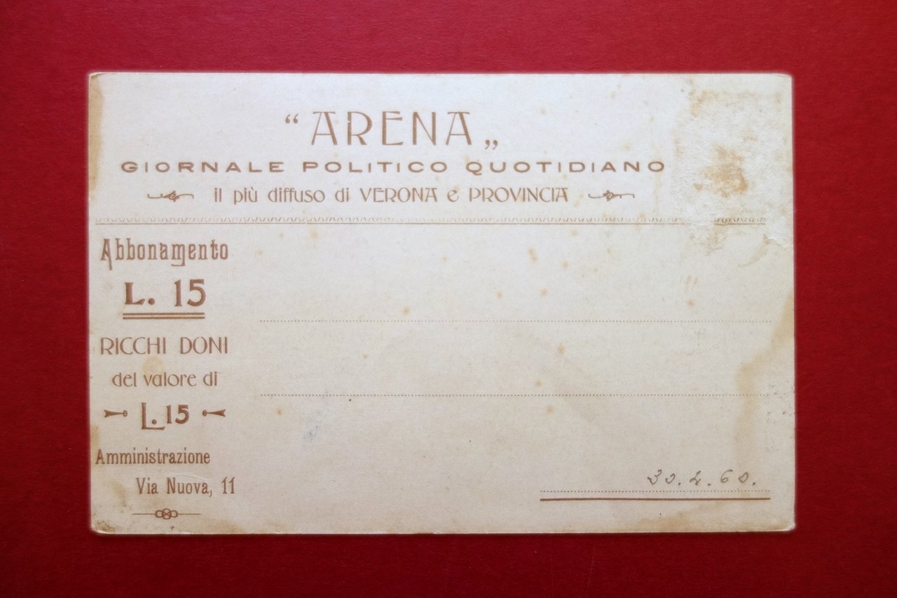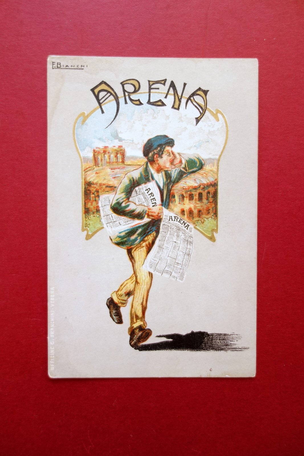 Cartolina originale, Arena" giornale politico quotidiano il pi√π diffuso di Verona e provincia Officine G. Franchini - Verona, s. d. (primo '900 circa); cartolina originale con bella grafica cromolitografica firmata F. Bianchi. Non viaggiata. Cm 13,5x9. Condizioni di conservazione Cartolina ben conservata con trascurabili difetti agli angoli, due angoli con una lieve marginale ombra di gora, al retro qualche minima brunitura e una piccola leggera abrasione (probabilmente rimozione di francobollo). Per maggiori dettagli vedi foto. CART.2551 N "