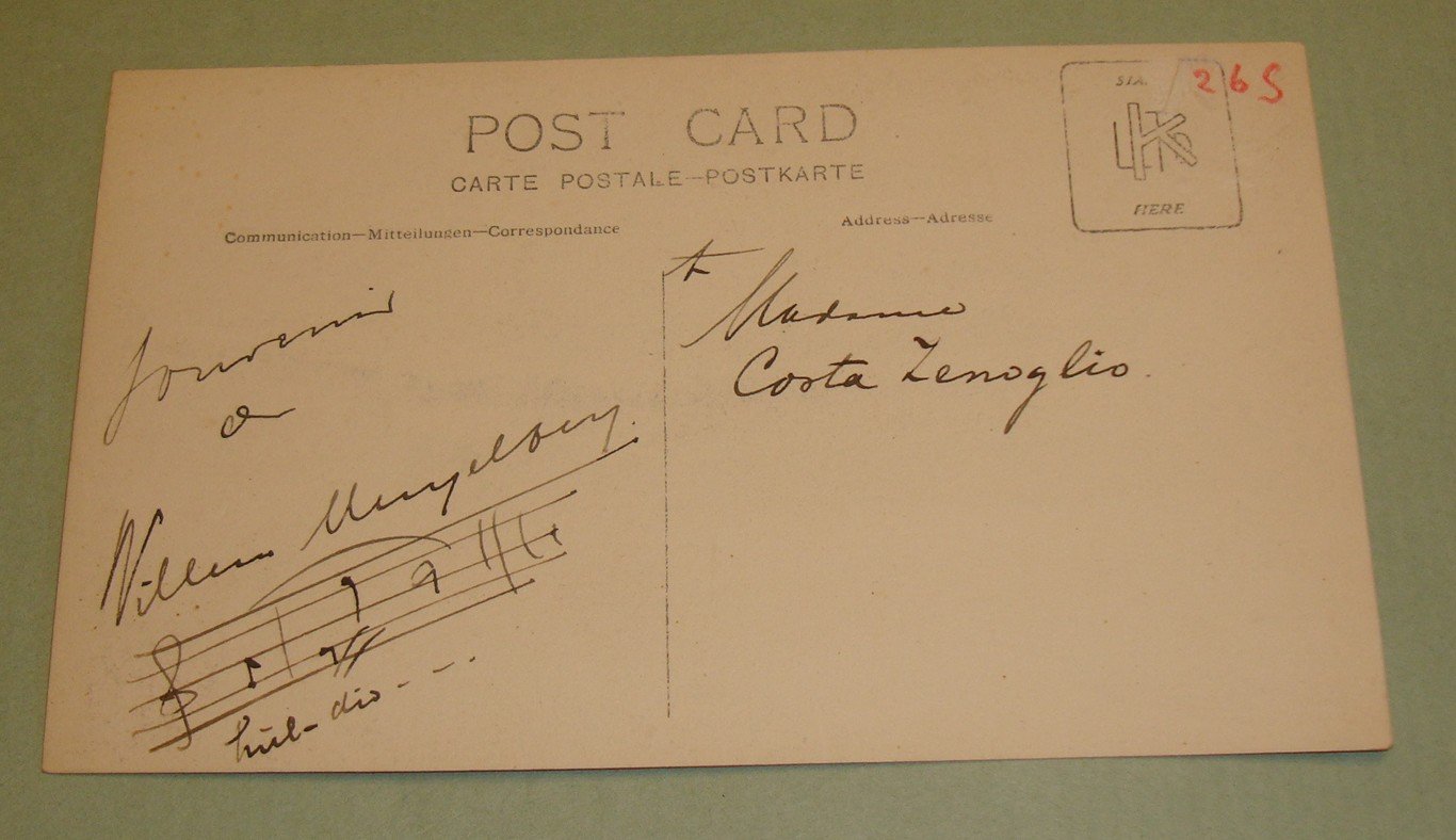 MENGELBERG J. Willem. Celebre direttore d'orchestra. 1871 - 1951. Cartolina autografa firmata diretta a M.me Costa Zenoglio. Dopo la firma due battute musicali.