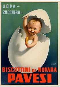 Cartolina-cartoncino pubblicitario della Pavesi di Novara illustrata da Boccasile, raffigurante un bambino che esce da un uovo con un biscotto in una mano e nell'altra un pezzo di guscio