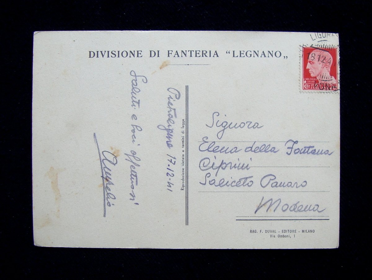 Cartolina, Divisione Fanteria Legnano" Alberto Giussano Duval, Milano, 1941; cm 15x10,5; cartolina illustrata a colori da Codognato; viaggiata. Condizioni di conservazione Esemplare in buono stato, qualche macchietta al retro, minusculi difetti agli angoli; per condizioni vedi foto. CART.1985 blu "