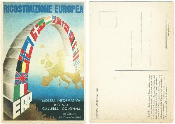 ERP - Ricostruzione Europea - Mostra Informativa - Roma - Galleria Colonna, 30 Ottobre - 28 Novembre 1948. Bella illustrazione a colori. SO. GRA. RO., 1948. Cartolina non viaggiata. 10,5x15,5. Rara e in Ottimo stato. , Buono (Good)