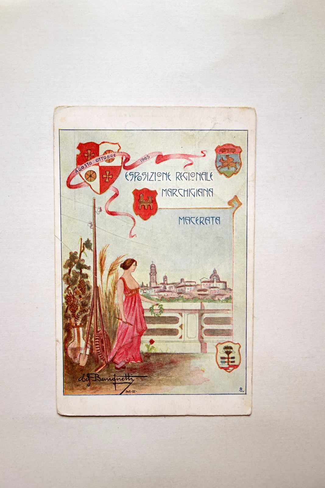 Cartolina, Esposizione Regionale Marchigiana Macerata agosto - ottobre 1905 Emporio Cartoline Illustrate - A. Palmieri, Macerata 1905; cartolina con bella grafica d'epoca a colori. Viaggiata. Cm 9x14. Condizioni di conservazione Ben conservata con minimi difetti agli angoli, leggerissimi aloni. Per maggiori dettagli vedi foto. CART.3258 N