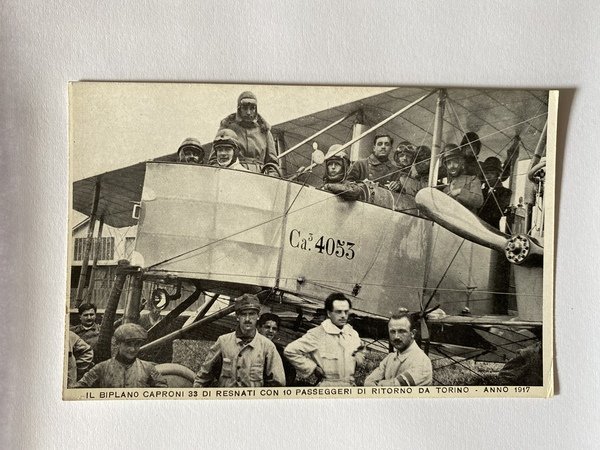 Cartolina Il biplano Caproni 33 di Resnati con 10 passeggeri di ritorno da Torino anno 1917