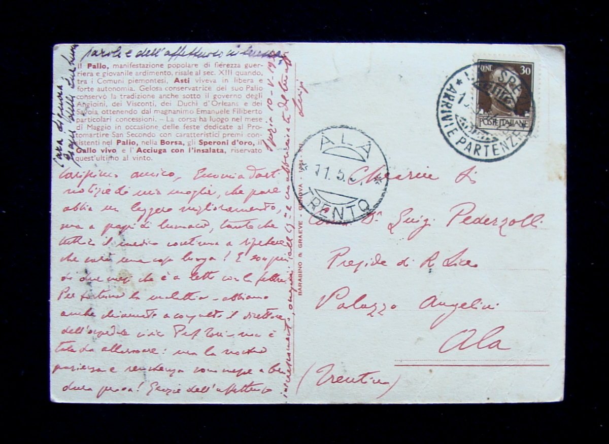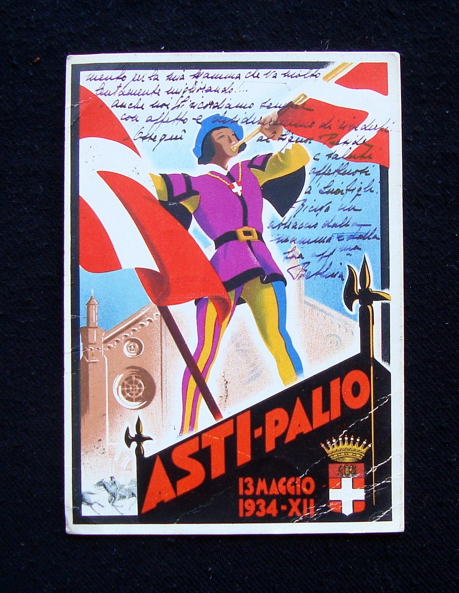 Cartolina originale, ASTI-PALIO 13 maggio 1934-XII Barabino & Graeve, Genova; 1934-XII; cm 15x10,5; cartolina illustrata a colori viaggiata con testo manoscrtto fronte e retro. Condizioni di conservazione Esemplare in modeste condizioni con pieghette varie (vedi foto). RARA CART.1931 blu
