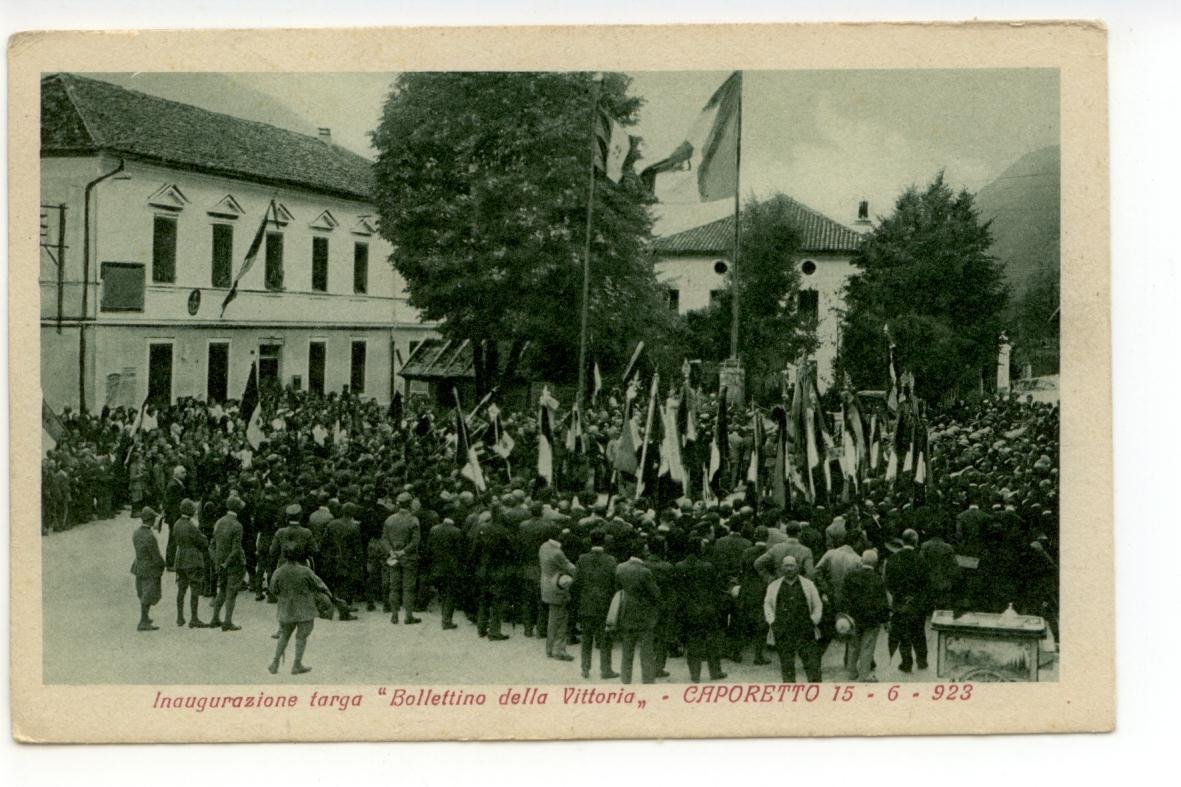 Cartolina originale, Inaugurazione Targa Bollettino della Vittoria" Caporetto S. d. (anni venti); cartolina originale ill. verdastra. Cm 14x9. Figurata; non viaggiata. Condizioni di conservazione Cartolina ben conservata (vedi foto). CART.2196G "