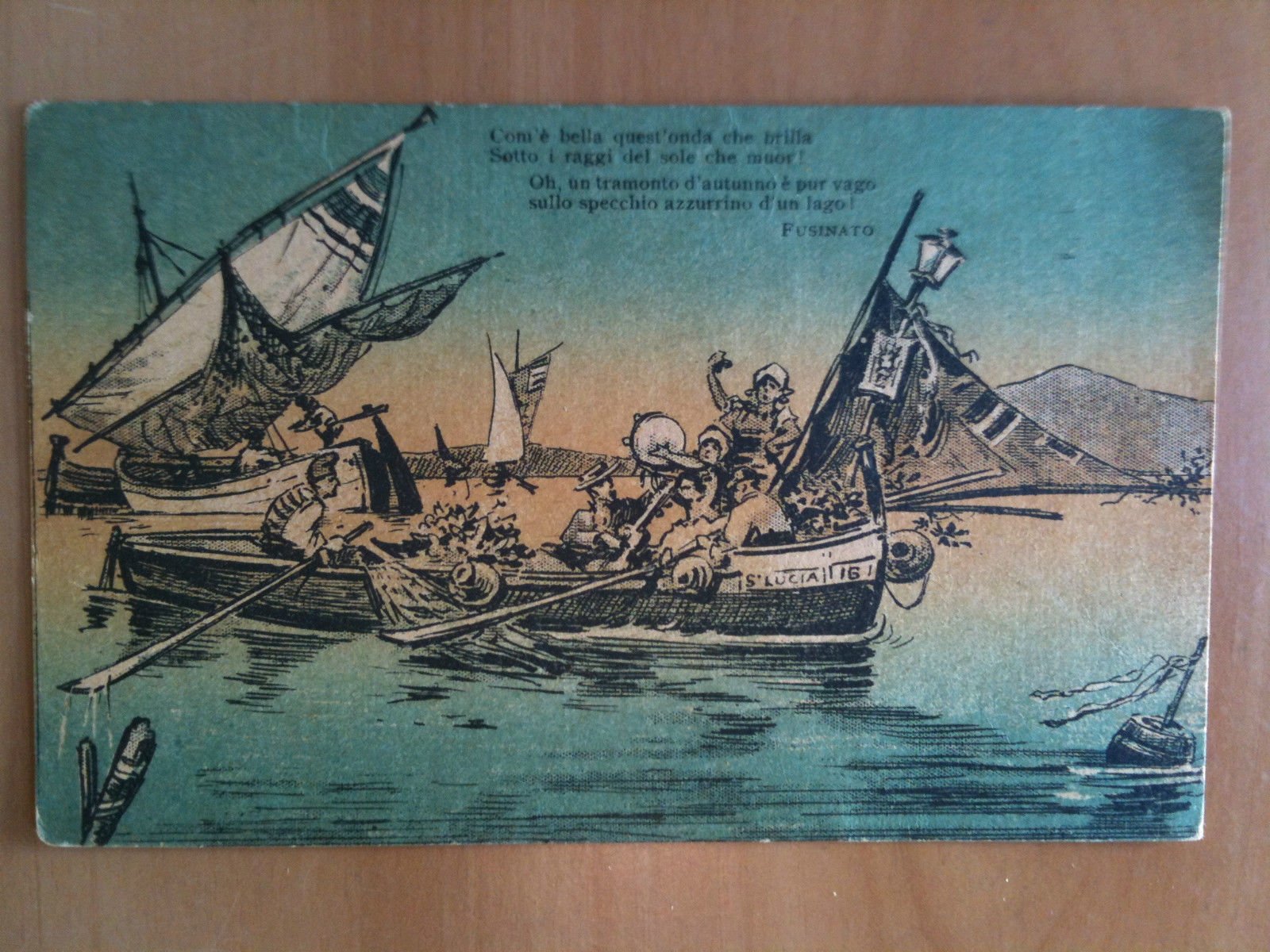 Cartolina illustrata inizi '900Com'è bella quest'onda che brilla/sotto i raggi del sole che muor!Oh, un tramonto d'autunno è pur vago/sullo specchio azzurro d'un lago!Fusinato viaggiata - in buono stato e1698