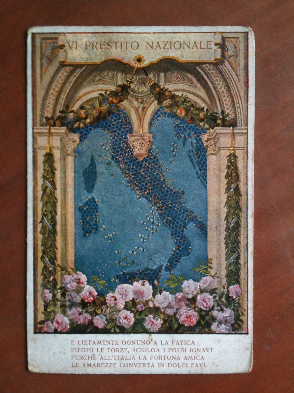 Cartolina inizi '900Illustrazione dell'ItaliaVI Prestito Nazionalee lietamente ognuno a la fatica pieghi le forze, sciolga i polsi ignavi perchè all'Italia la fortuna amica le amarezze converta in dolci favinon viaggiata - in buono statoE3742