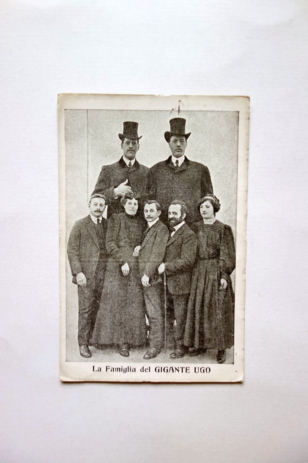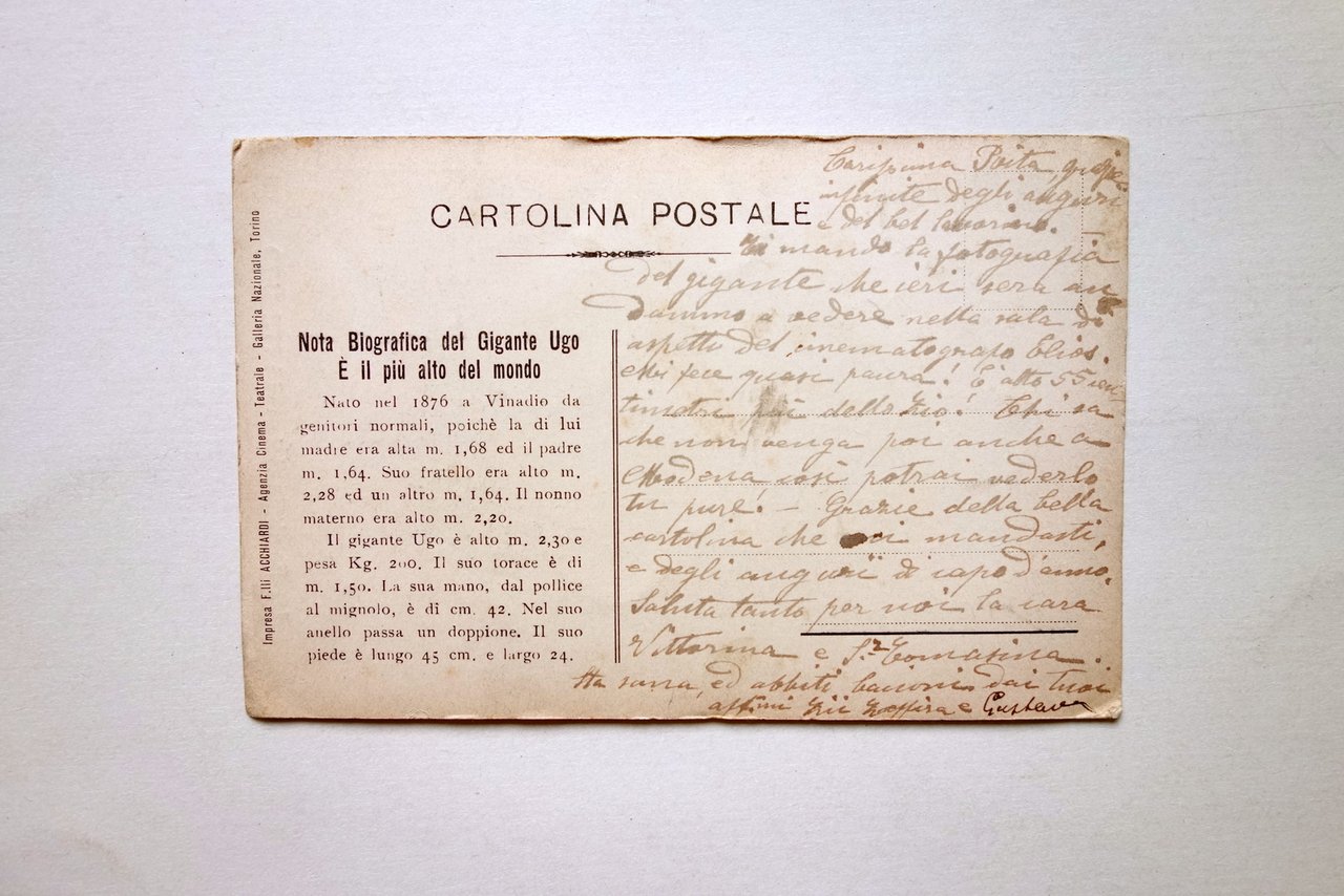 Cartolina, La famiglia del gigante Ugo è il più alto del mondo S. d. ma primi anni del '900; cartolina ill. in b/n; compilata; al retro breve descrizione a stampa del gigante (vedi foto). Cm 9,5x14,5. Condizioni di conservazione Ben conservata con minimi difetti ai margini e agli angoli; pochi piccoli leggerissimi aloni. Per maggiori dettagli vedi foto. La compilazione a penna reca una breve descrizione dello spettacolo del gigante, tenutosi nella sala d'aspetto del Cinema Elios. CART.3264 N