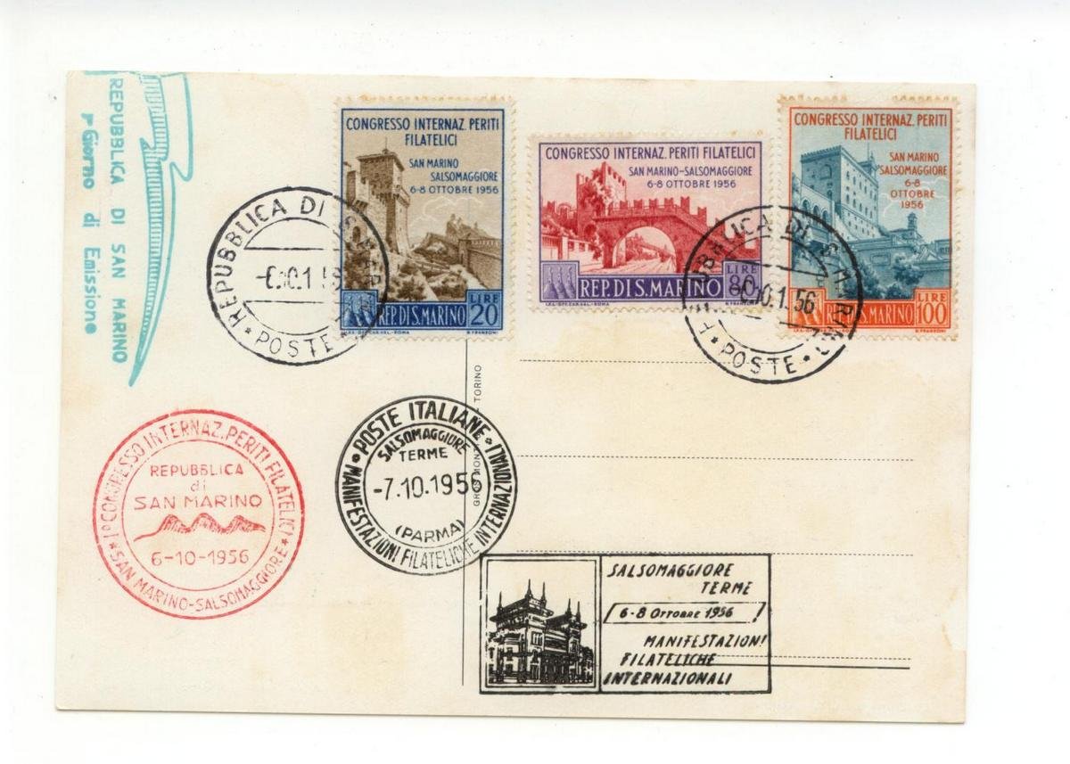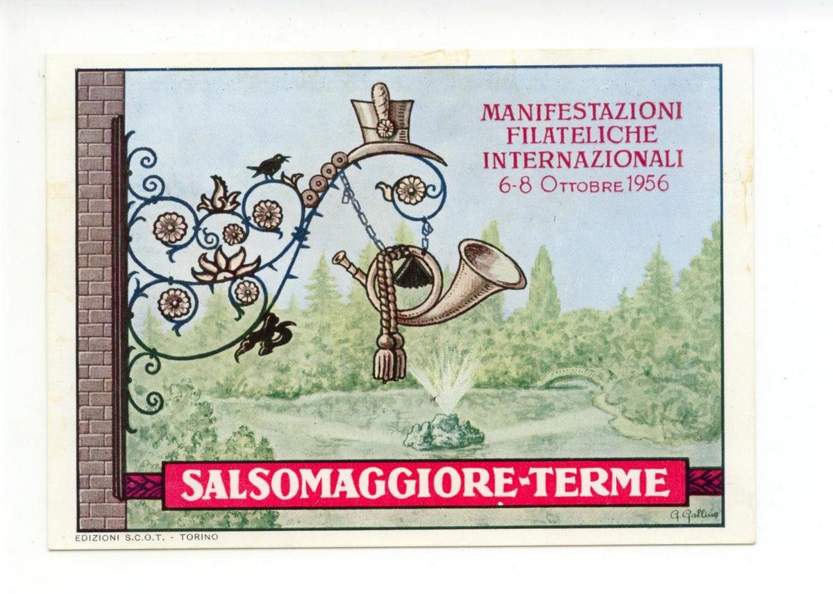 Cartolina originale, Manifestazioni Filateliche Internazionali 6-8 Ottobre 1956 Salsomaggiore-Terme 1956; cartolina originale ill. a col. Cm 15x10,5 (formato grande). Non viaggiata. Condizioni di conservazione Cartolina molto ben conservata (vedi foto). CART.2929G