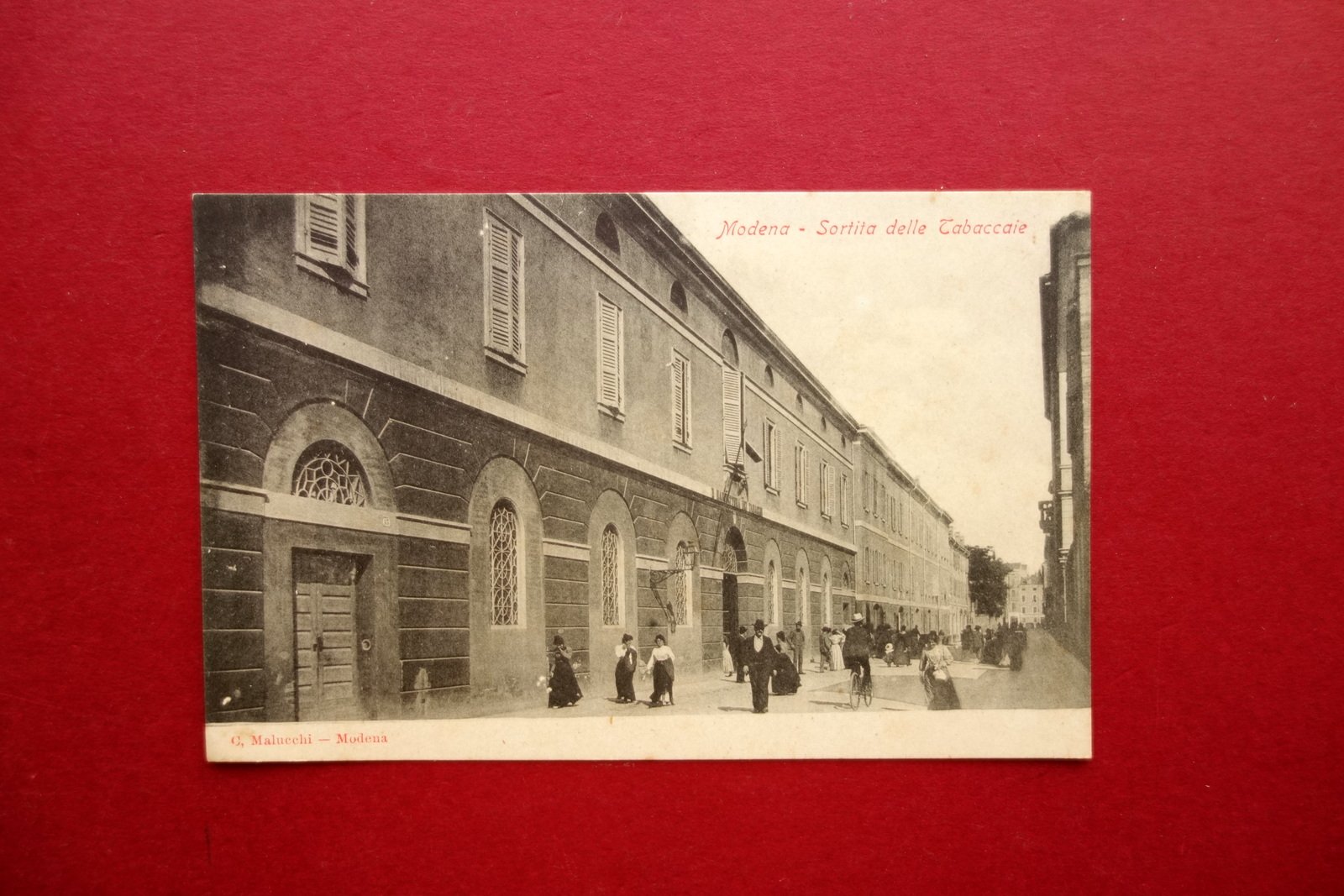 Cartolina, Modena - sortita delle tabaccaie G. Malucchi, Modena, s. d. ma primo '900; cartolina postale ill. in b/n; non viaggiata. Cm 9x14. Condizioni di conservazione Ben conservata con alcune leggere bruniture. Per maggiori dettagli vedi foto. CART.3273 N