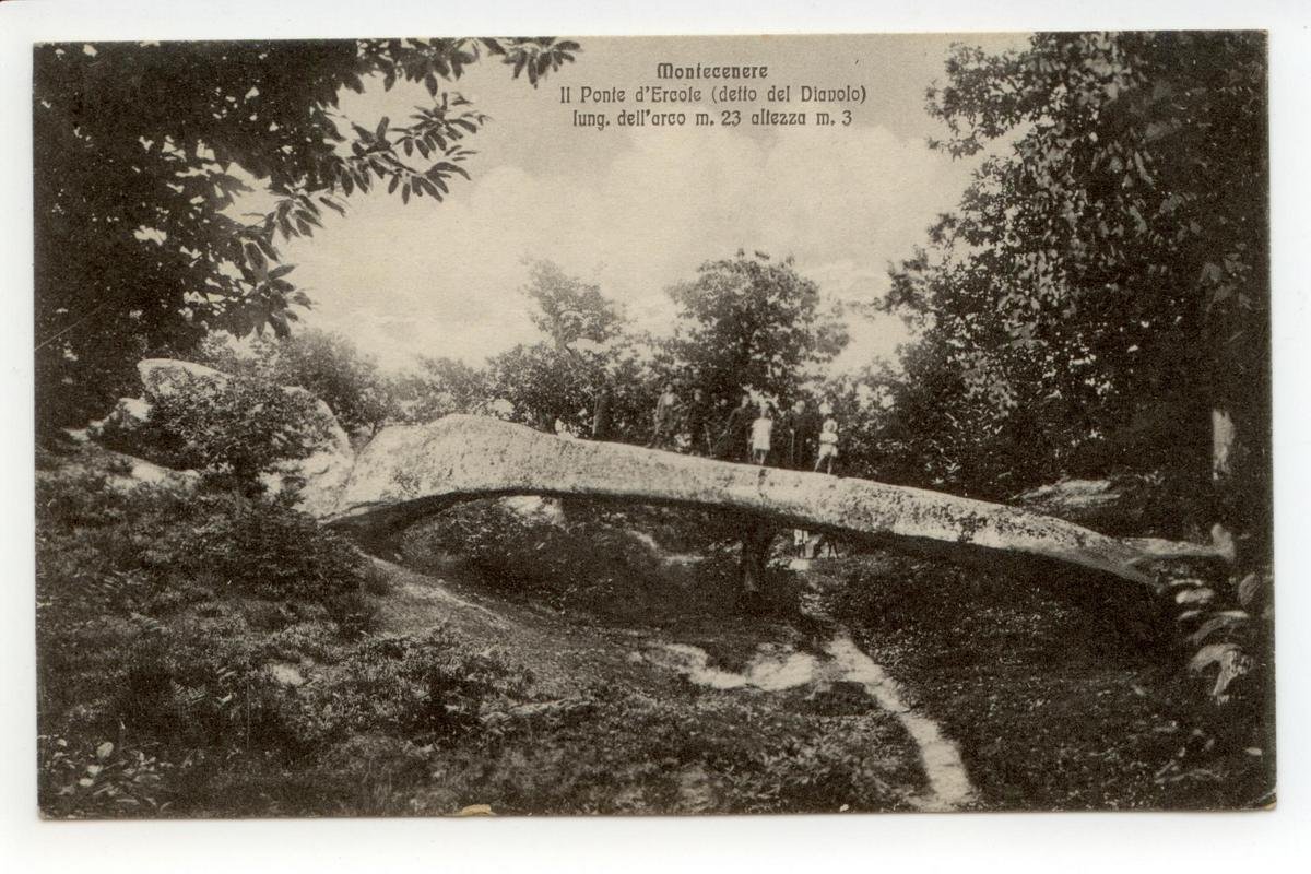 Cartolina originale, Montecenere Il Ponte d'Ercole (detto del Diavolo) 1936; cartolina originale ill. in b/n. Viaggiata. Figurata. Cm 14x9. Condizioni di conservazione Cartolina ben conservata. Alcune bruniture al retro. Una piccola piega all'angolo inf. destro (vedi foto). CART.3218G