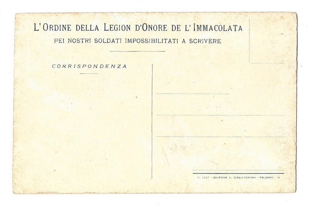 Cartolina Originale d'epoca. Per i nostri Soldati impossibilitati a scrivere - L'Ordine della Legion d'Onore de l'Immacolata. Illustrata. Grafiche Gianni Trapani - Palermo. Ottimo stato. , Molto buono (Very Good)