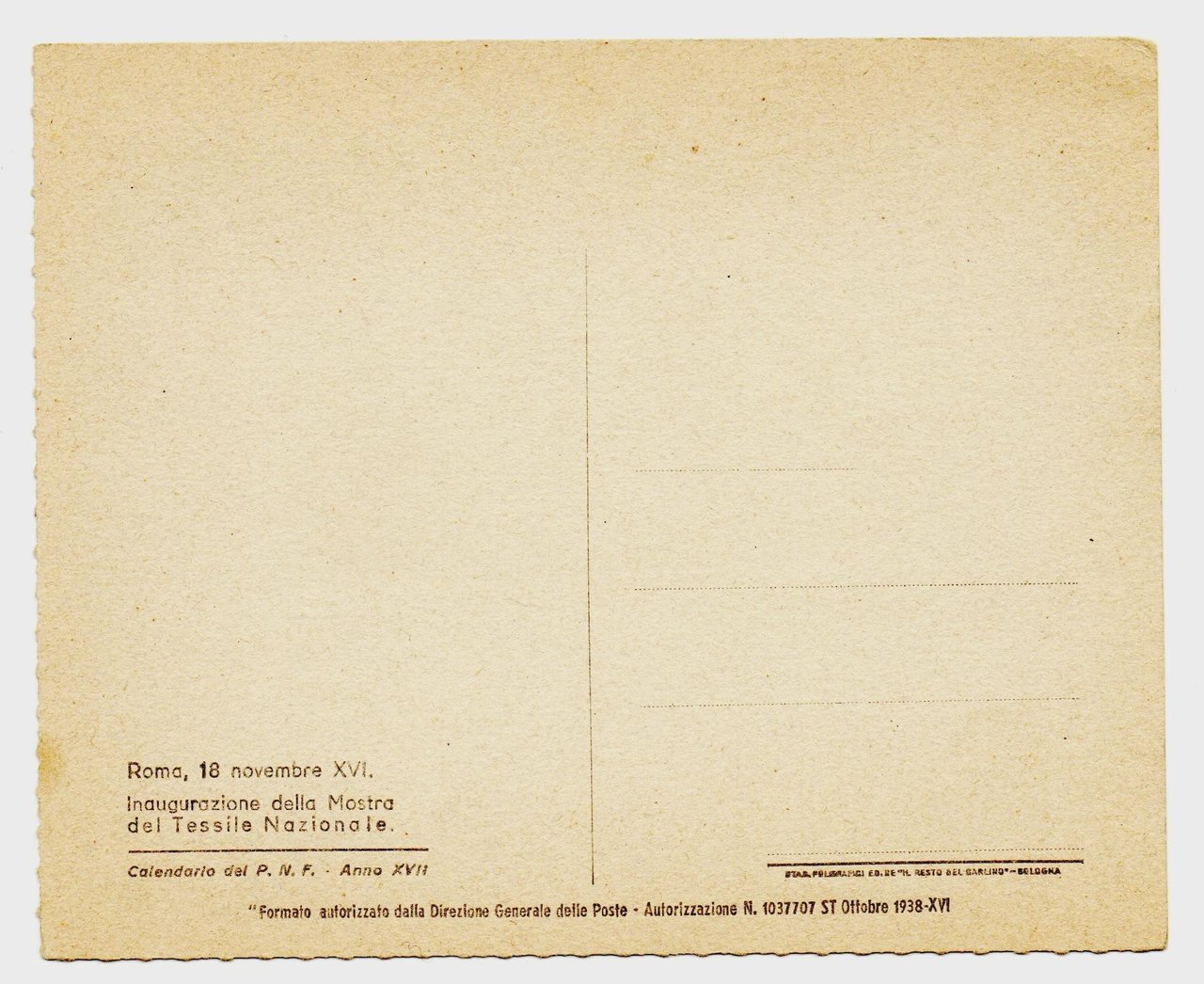 Cartolina commemorativa P.N.F. - Inaugurazione della Mostra del Tessile Nazionale, Roma 18 Novembre 1938. Ed. Il Resto del Carlino - Bologna, 1938. Cartolina non Viaggiata. Formato grande. 16x13. Rara, Ottimo stato. ,
