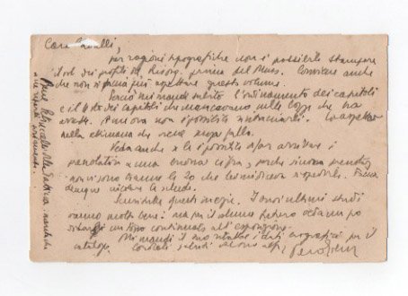 AUTOGRAFODocumento autografo originale.Minuto foro per inchiostro al bordo alto della cartolina, in prossimità del nome del destinatario; per il resto, ottimo esemplare.Diciassette righe autografe in cui Gobetti riferisce a Cavalli la necessità di anticipare, per ragioni tipografiche, la pubblicazione del volume dell’intellettuale faentino su Mussolini. Si tratta di un testo di estremo interesse, considerando che il libro non vide le luce sotto le insegne della Piero Gobetti Editore.