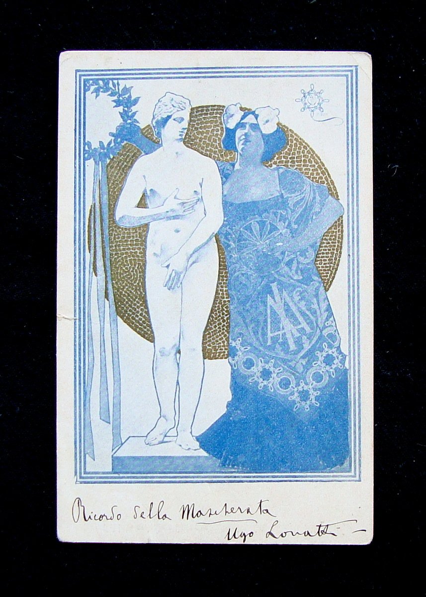 Cartolina postale, A.I.A Associazione Italiana Artisti Ricordo della mascherata" s.d.t.; s.d.; 1940; cm 14x9; cartolina illustrata a colori( bl√π e dorato) manoscrtta ma non viaggiata. Condizioni di conservazione Esemplare in discrete condizioni con pieghetta all'angolo sup. destro e piccolo strappetto al margine sinistro (vedi foto). CART.1933 blu "