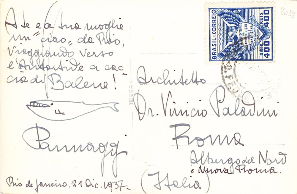 AUTOGRAFO «A te e a tua moglie un “ciao” da Rio, viaggiando verso l’Antartide a caccia di Balene!». Segue il disegnino di una balena. Documento proveniente dalla collezione Sergio Cereda.