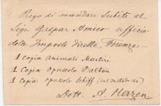 AUTOGRAFOMedico russo, Herzen fu insegnante di fisiologia nelle Università di Firenze e di Losanna. Primogenito dal noto rivoluzionario populista Aleksandr Herzen. Richiede di inviare alcuni opuscoli al Sig.r Gaspar, “amico Ufficio delle Imposte dirette, Firenze”.