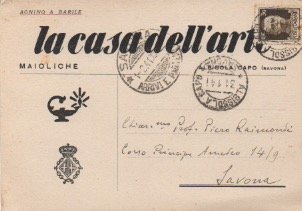 - Scritto il recto. Al verso l’indirizzo del destinatario. Manoscritto a inchiostro nero su carta con intestazione “Agnino & Barile/La casa dell’arte/Maioliche”.