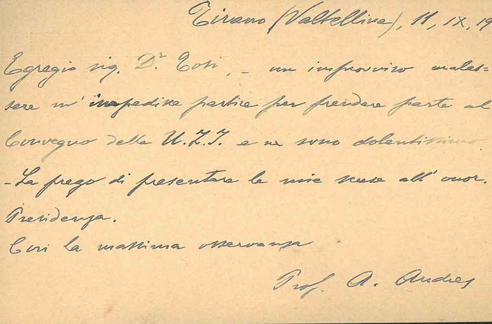 14x9 cm; 6 righe manoscritte e autografe in cui l'autore si scusa per non poter partecipare al convegno della UZI