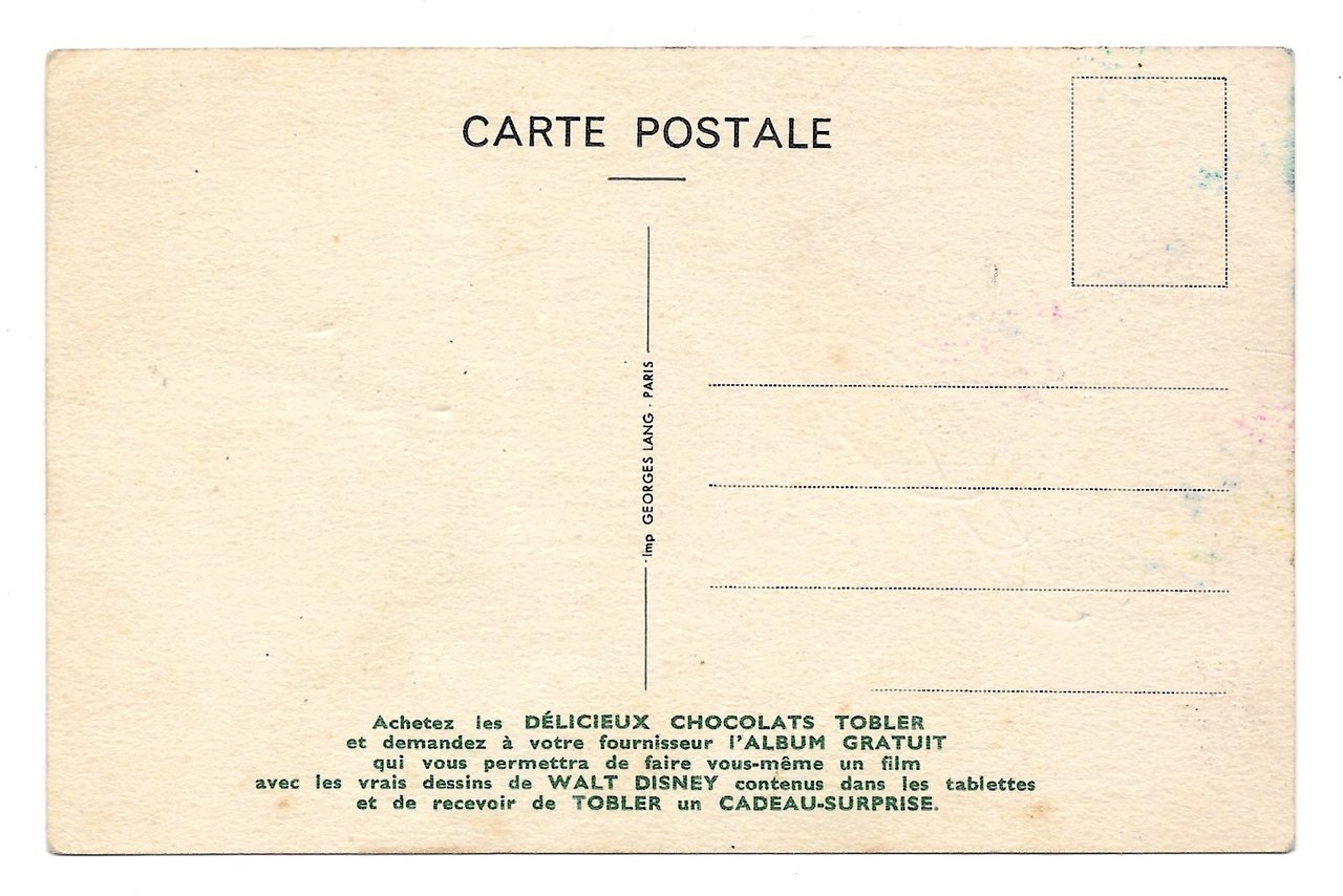 Cartolina Originale Pubblicitaria: Délicieux Chocolats Tobler. Walt Disney - Stromboli (Pinocchio). Non viaggiata. Imp. George Lang - Paris, anni '40. Lievissime bruniture del tempo. 9x14. Rara e in Ottimo stato. , Molto buono (Very Good)