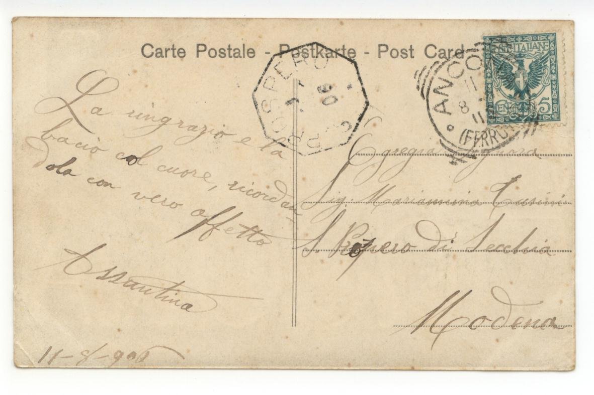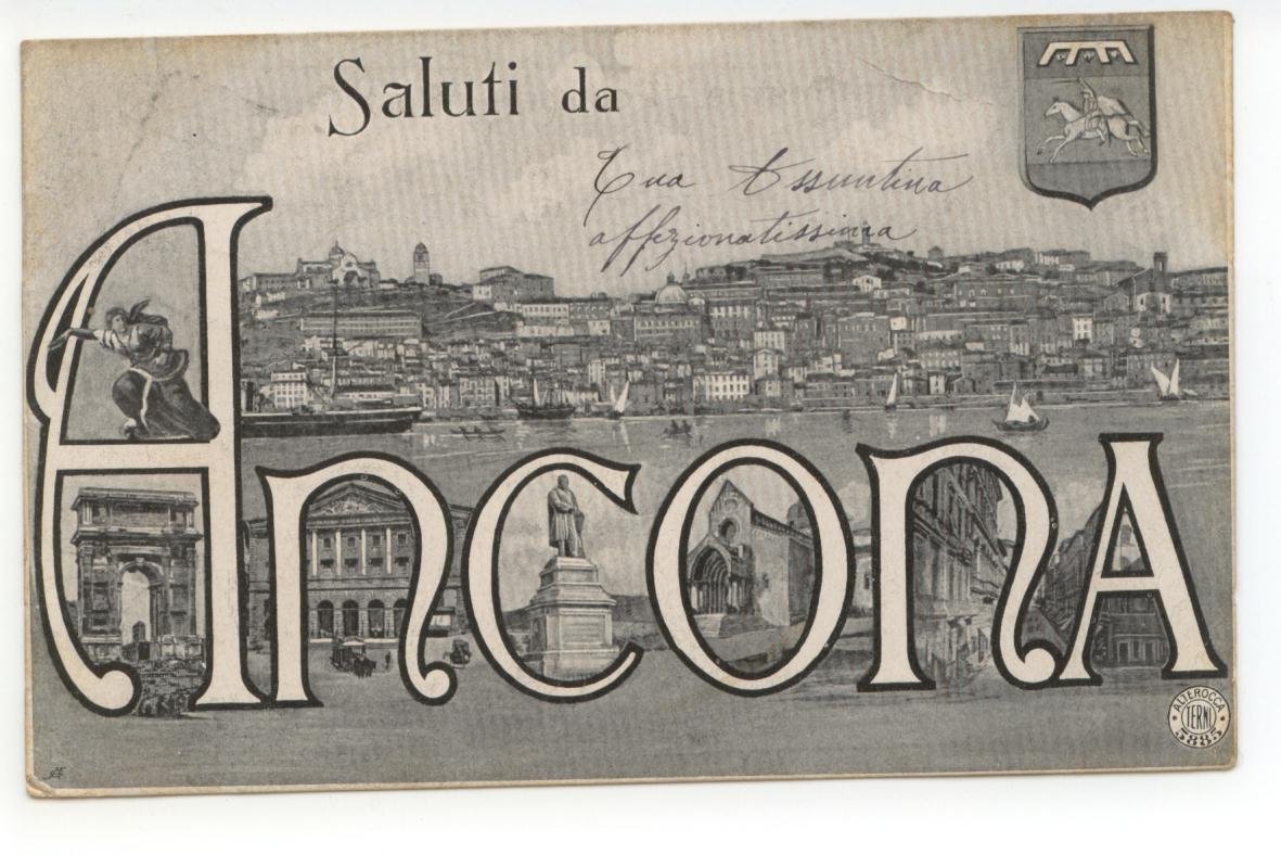 Cartolina originale, Saluti da Ancona 1906; cartolina originale ill. in b/n. Cm 14x9. Viaggiata. Condizioni di conservazione Cartolina ben conservata. L'angolo sinistro è un poco piegato (vedi foto). CART.2107G