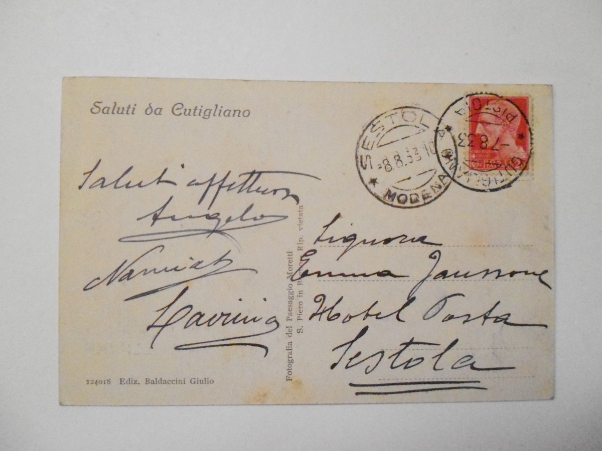 Cartolina originale, Saluti da Cutigliano Ediz. Baldaccini Giulio, Pistoia, 1933; cartolina originale ill. in b/n. Viaggiata. Cm 14x9. Condizioni di conservazione Cartolina molto ben conservata. Qualche lieve macchietta al fronte e al retro (vedi foto). Tre vedutine. CART.3198G