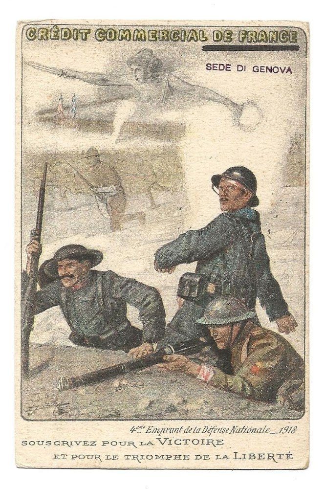 Cartolina originale d'epoca. Emprunt de la Défense Nationale - 1918 - Crédit Commercial de France - Sede di Genova. Souscrivez pour la Victoire et pour le Triomphe de la Liberté. Illustrata. Imp. H. Chachoin - Paris, 1918. Non Viaggiata e in Ottimo stato. , Molto buono (Very Good)
