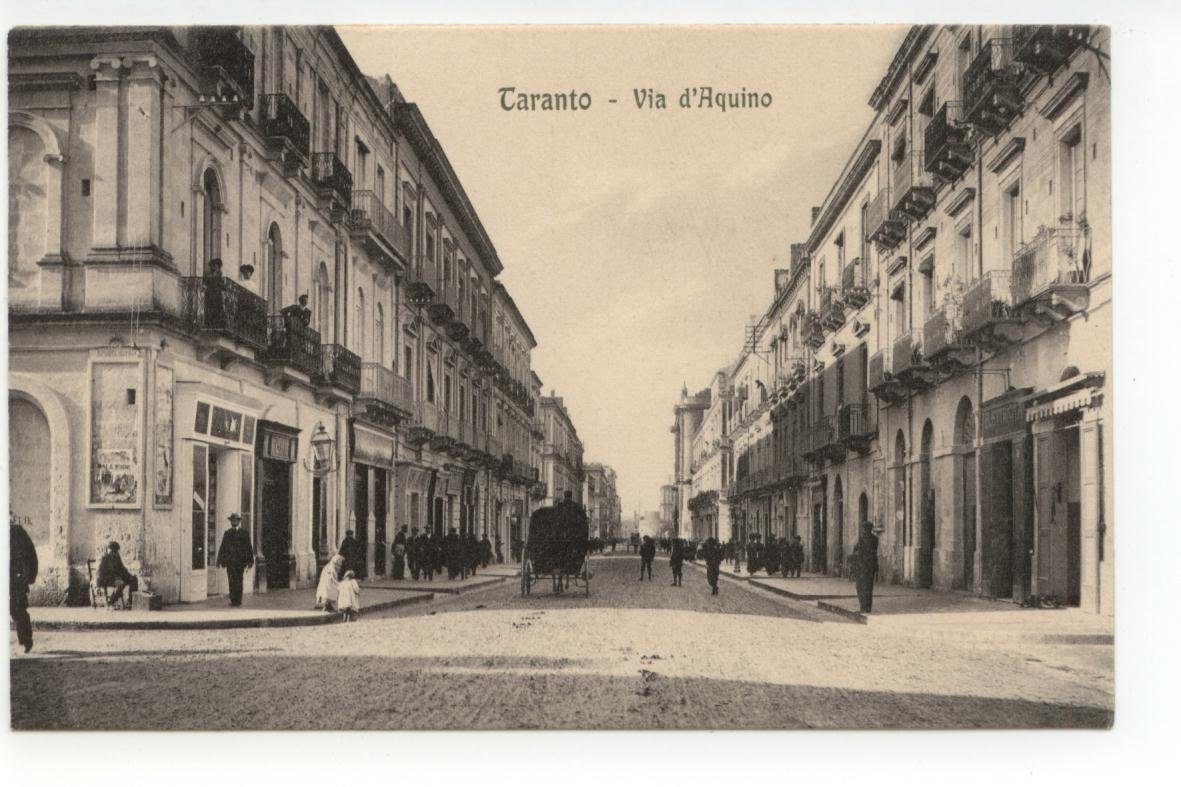Cartolina originale, Taranto Via d'Aquino S. d. (anni 1915-20); cartolina originale ill. in b. n. Cm 14x9. Figurata e animata; non viaggiata. Condizioni di conservazione Cartolina molto ben conservata (vedi foto). CART.1854G