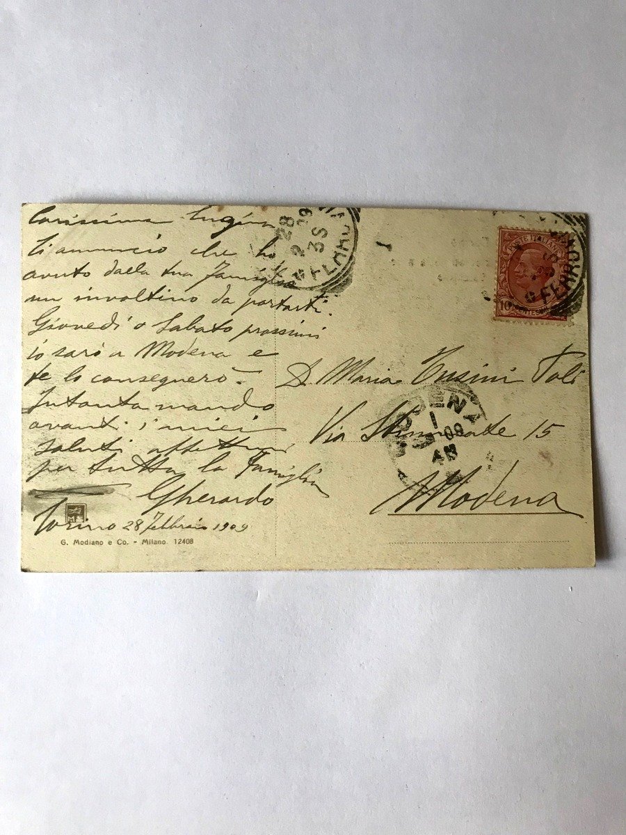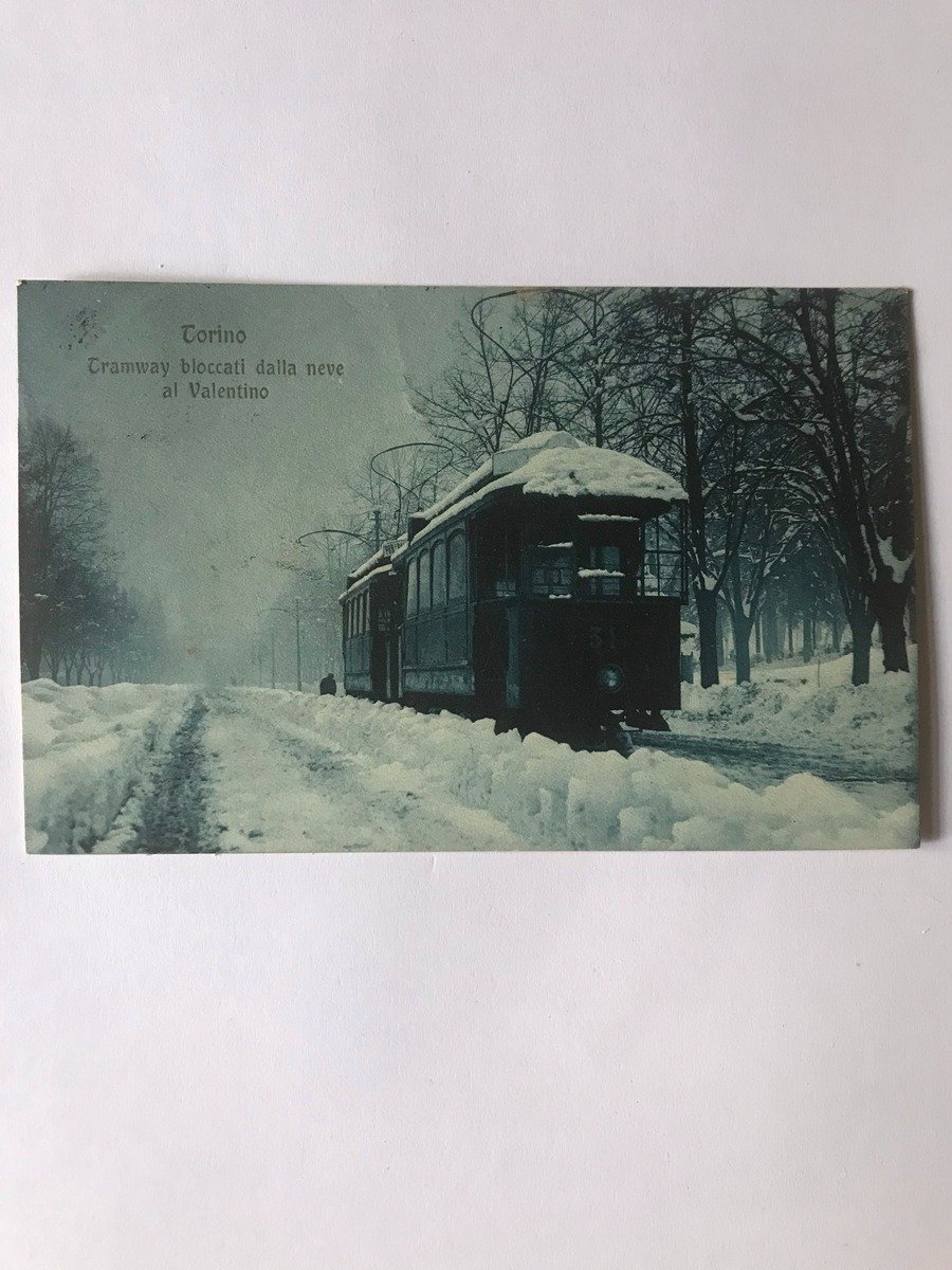 Cartolina Tramway bloccati dalla neve al Valentino (Torino) 1909 G.Modiano Milano ,Cartolina in b.n. Dimensione: 8,8x14 cm. Viaggiata timbro postale 1909 Condizioni di conservazione Cartolina in ottimo stato di conservazione con minime tracce del tempo. CART.0766 blu CART.0766 blu