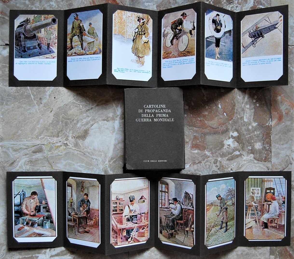 CDE, 1971. In-16, brossura, raccoglitore con 48 riproduzioni a colori di cartoline di propaganda della Prima Guerra Mondiale. Mancanze alla brossura esterna, le 48 cartoline sono in ottimo stato.